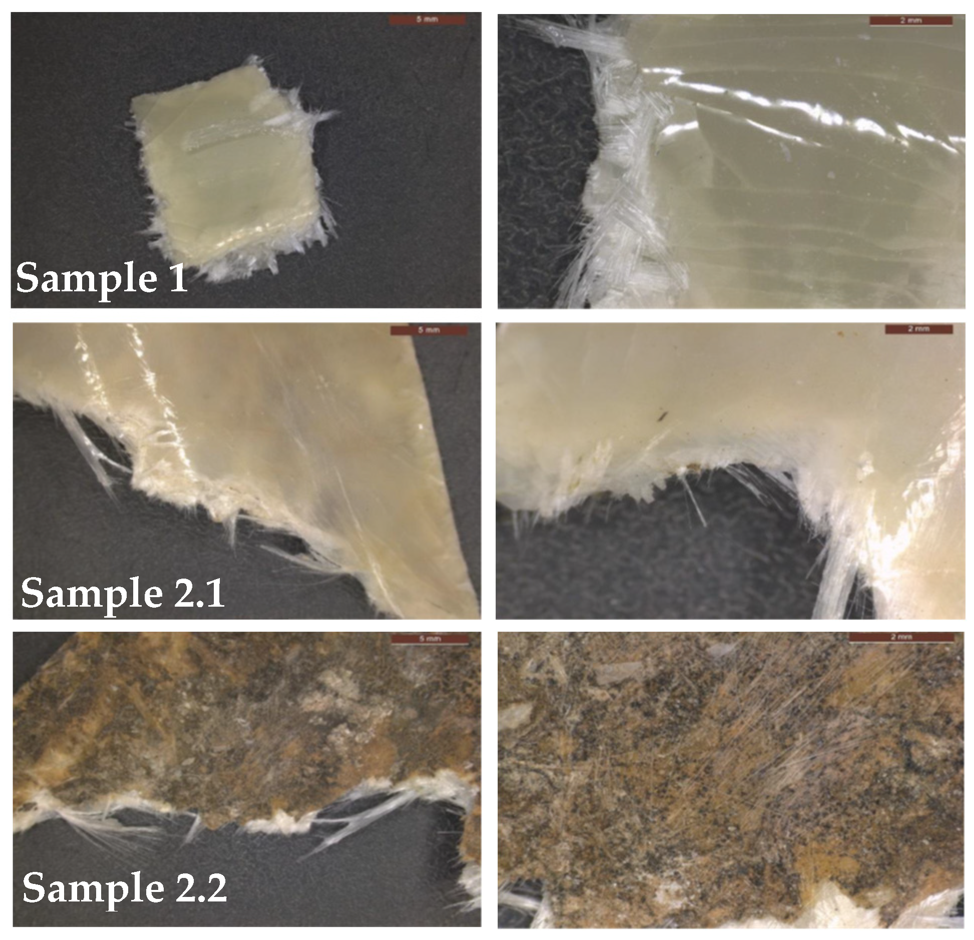 In parallel, the four pre-consumer composites supplied by an industrial manufacturer were included to represent the principal resin chemistries and production routes used in European construction and infrastructure applications. Epoxy, polyester, and vinyl ester thermosets, combined with infusion and pultrusion manufacturing processes, collectively account for the majority of glass fiber composites used in panels, profiles, civil engineering components, and building elements. Although these specific items entered the study as waste offcuts, their resin–fiber architecture corresponds to standard commercial composite categories and therefore provides controlled, well-defined reference systems against which reaction mechanisms and fiber preservation can be reliably compared.