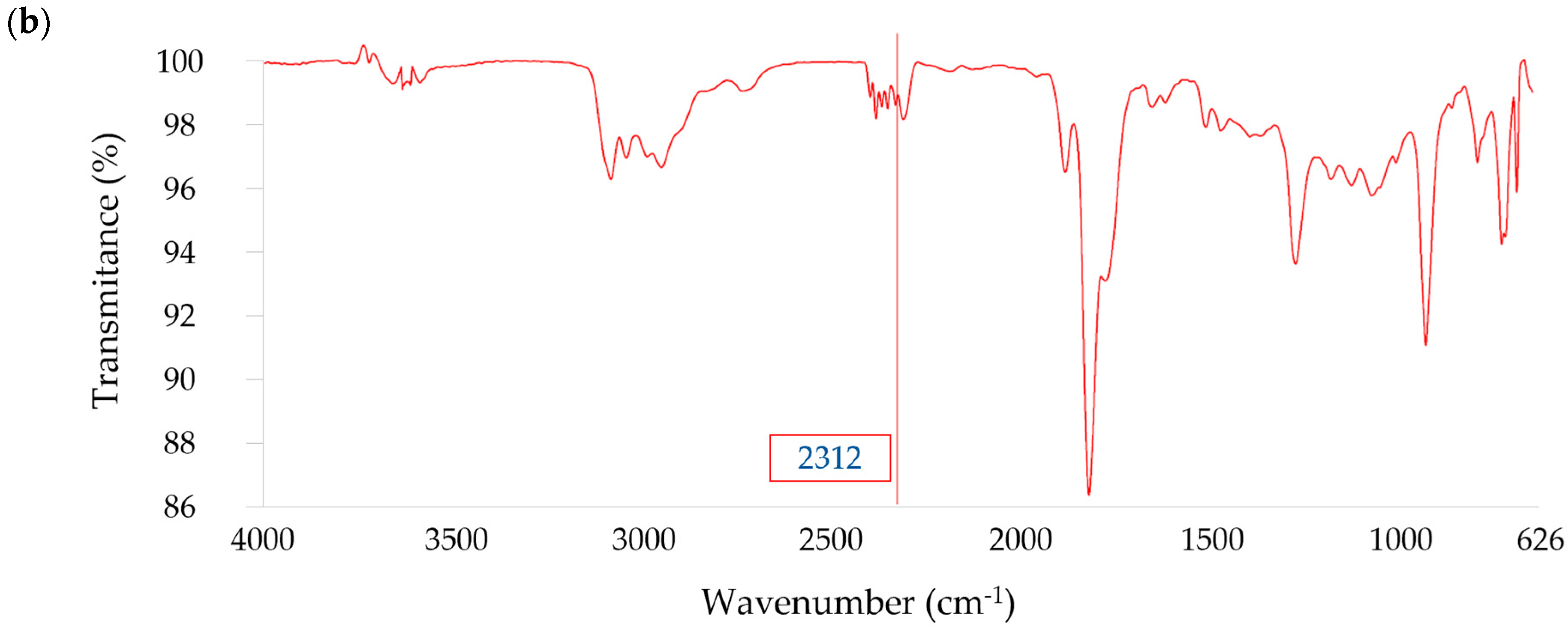 To further characterize the polymeric composition of the unknown CDW material, a qualitative assessment of the functional group composition of the samples was performed using Fourier-Transform Infrared Spectroscopy (FTIR). Measurements were conducted with a Spectrum Two spectrometer (PerkinElmer, Waltham, MA, USA; 6PG10052-048) over the spectral range of 4000–450 cm−1. The composite surface was placed in direct contact with the UATR (Universal Attenuated Total Reflectance) sample holder (PerkinElmer, Waltham, MA, USA; 6PG10052-048-02) and the resulting infrared spectra were compared with reference databases and standard samples to determine the chemical identity of the material.