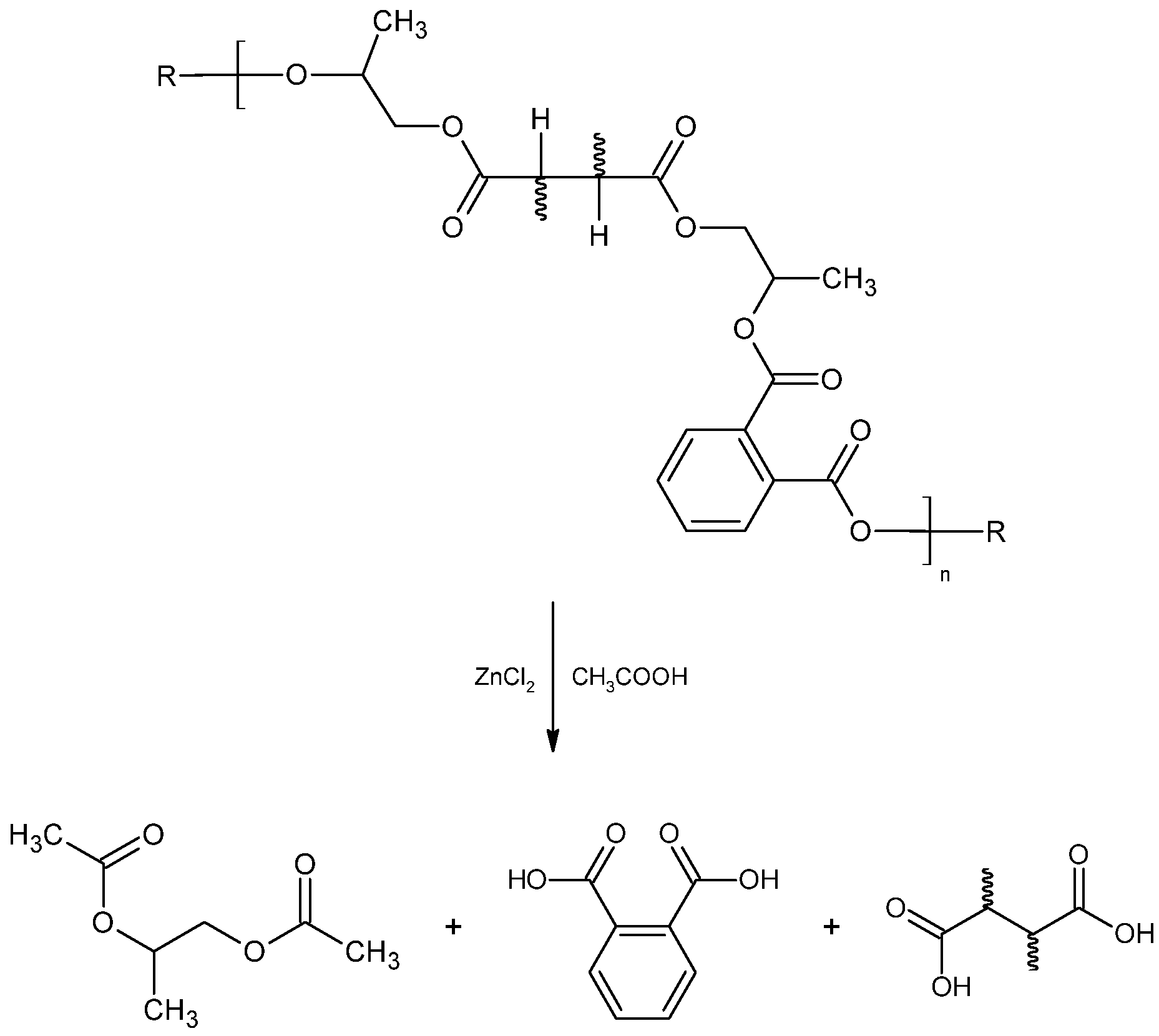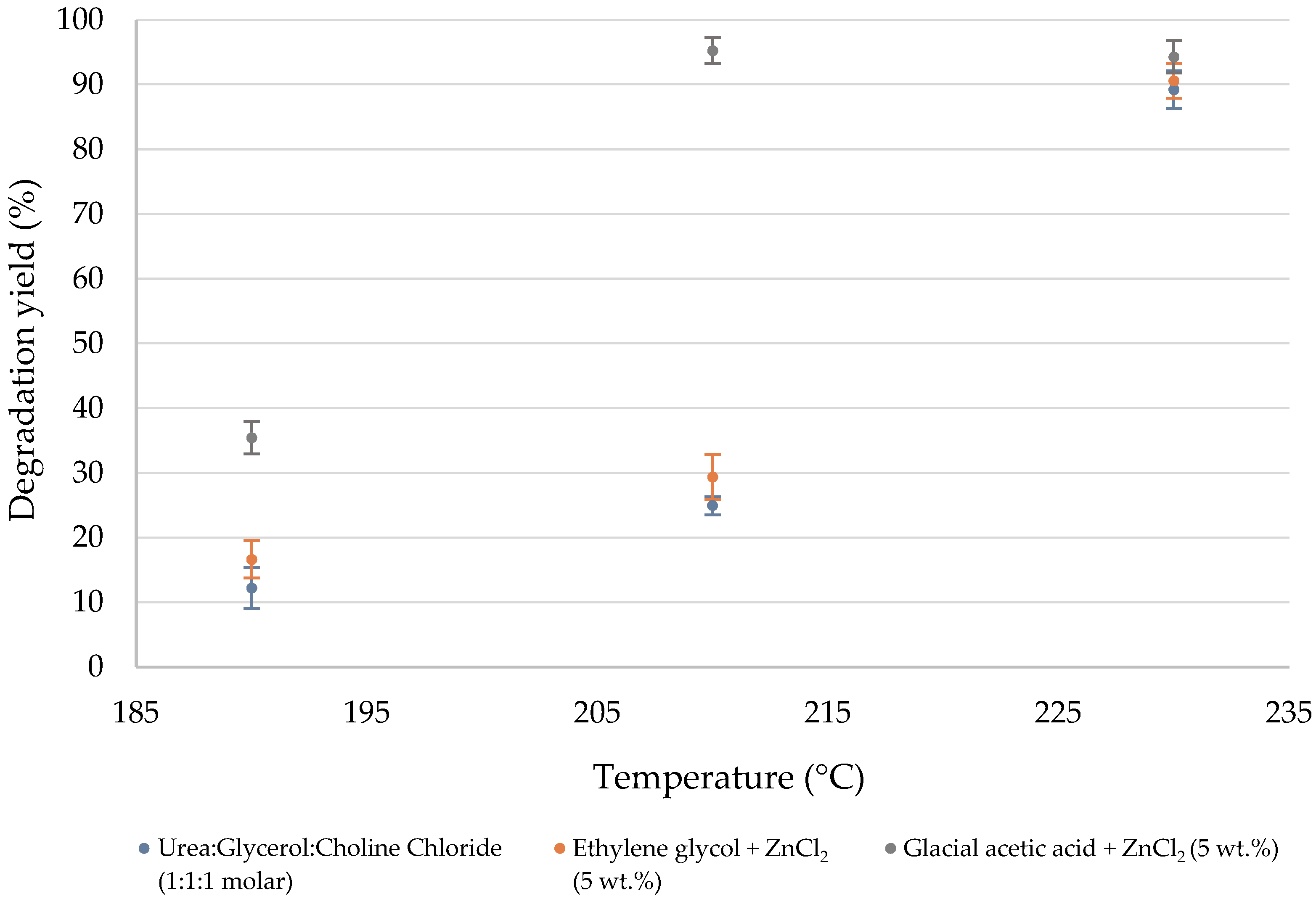 All reagents were used as received without further purification. Glacial acetic acid (≥99.7% purity, technical grade, VWR International S.A.S., Rosny-sous-Bois, France), ethylene glycol (≥99%, technical grade, VWR International S.A.S., Rosny-sous-Bois, France), zinc chloride (≥98%, VWR International S.A.S., Rosny-sous-Bois, France), choline chloride (≥98%, Sigma-Aldrich Co., St. Louis, MO, USA), urea (≥99%, EssentQ®, Merck KGaA, Darmstadt, Germany), and glycerol (99%, Pharmapur®, Merck KGaA, Darmstadt, Germany) were used in the preparation of all solvent systems. All solvents and reagents met the purity levels commonly required for solvolysis and polymer degradation studies, ensuring reproducibility and comparability with the existing literature. Deep eutectic solvents (DESs) were prepared from these components as biodegradable alternatives for resin depolymerization.