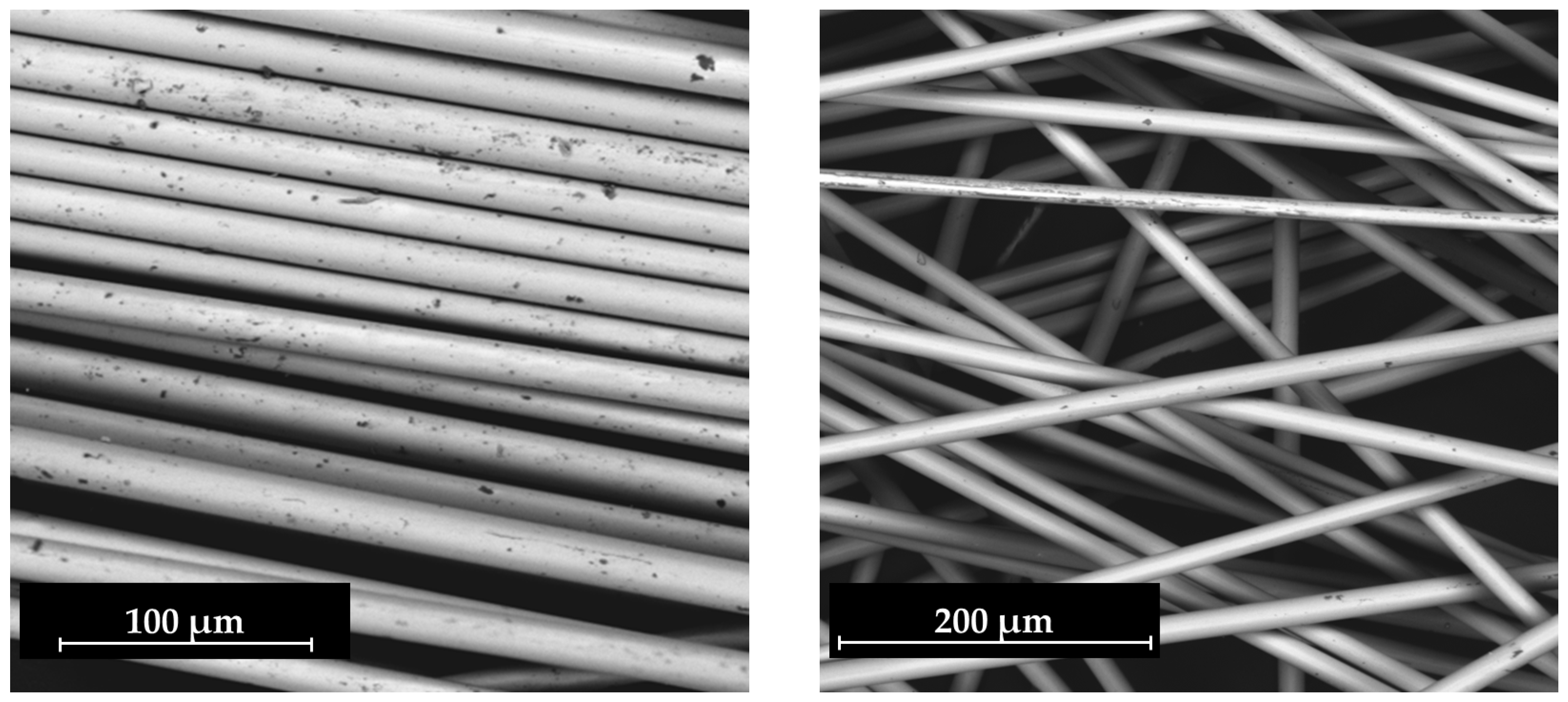 In trials achieving ≥80% matrix degradation, scanning electron microscopy (SEM) was used to inspect the fibers for possible ZnCl2 residues and structural damage using an IN-SPECT-F50 instrument (FEI, Hillsboro, OR, USA). The samples were placed in an aluminum sample holder on carbon tape by cutting a set of fibers with scissors and carefully gluing them onto the tape. Subsequently, 20 nm of carbon was deposited using a carbon coater (EM ACE200, Leica Microsystems GmbH, Wetzlar, Germany) and carbon wire as a source. The fibers were then observed under high vacuum and room temperature conditions and an accelerating voltage of 10 V and a spot size of 3 were used for imaging.