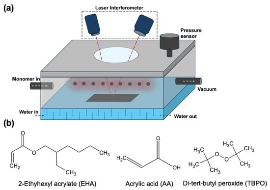 (a) The schematic representation of the iCVD system, (b) the chemical structure of EHA, AA and TBPO.