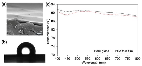 (a) Cross-sectional SEM image showing the thickness of the iCVD-deposited PSA thin film, (b) water contact angle measurement of the PSA-coated surface, and (c) optical transmittance spectra of bare and PSA-coated glass substrates.