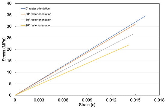 Comparison of the elastic tensile stress–strain response of uncoated FDM-printed PLA substrates with different raster orientations (0°, 30°, 60°, and 90°).