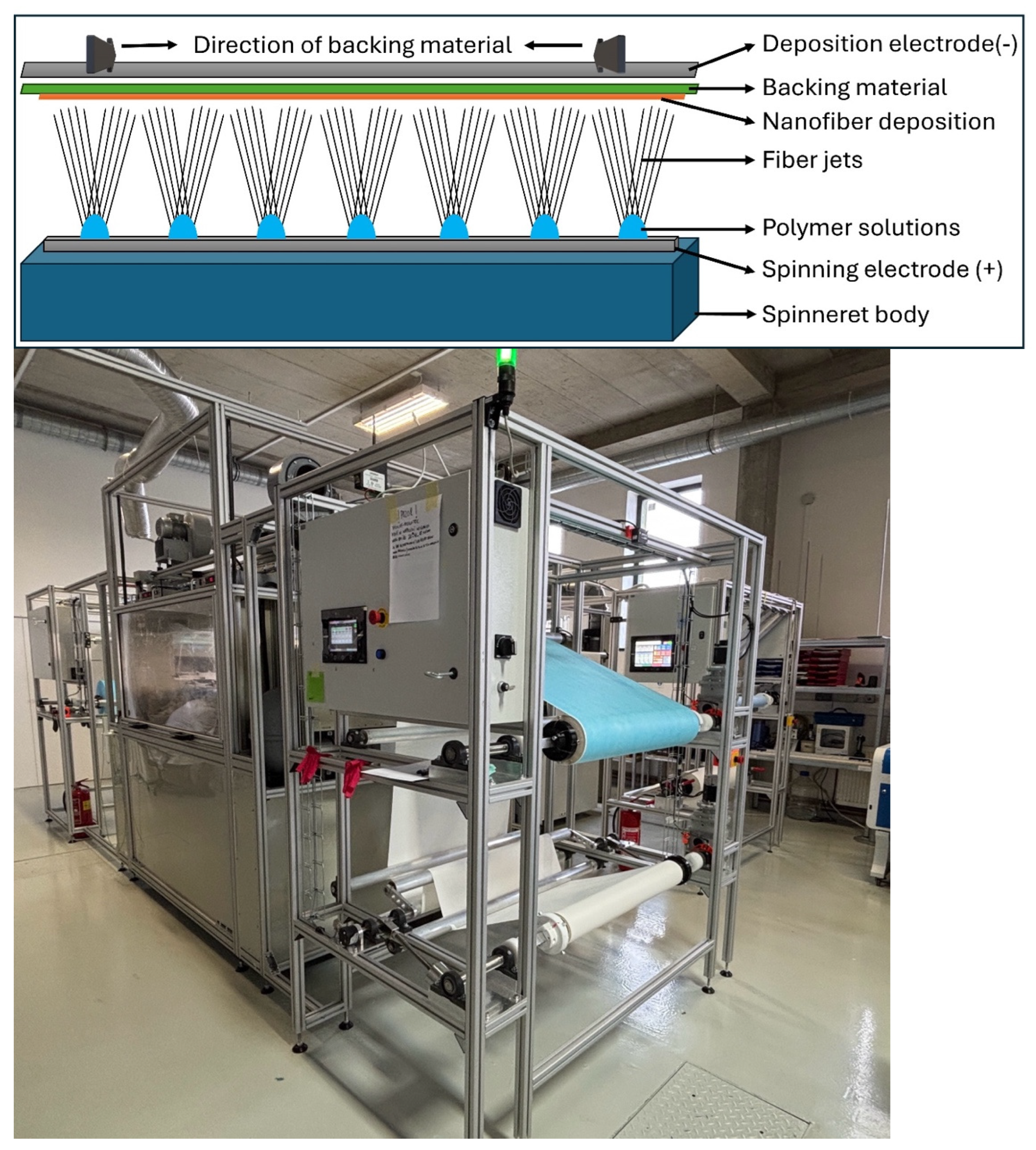 - Yalcinkaya, B.; Buzgo, M. A Guide for Industrial Needleless Electrospinning of Synthetic and Hybrid Nanofibers. Polymers 2025, 17, 3019. [Google Scholar] [CrossRef]