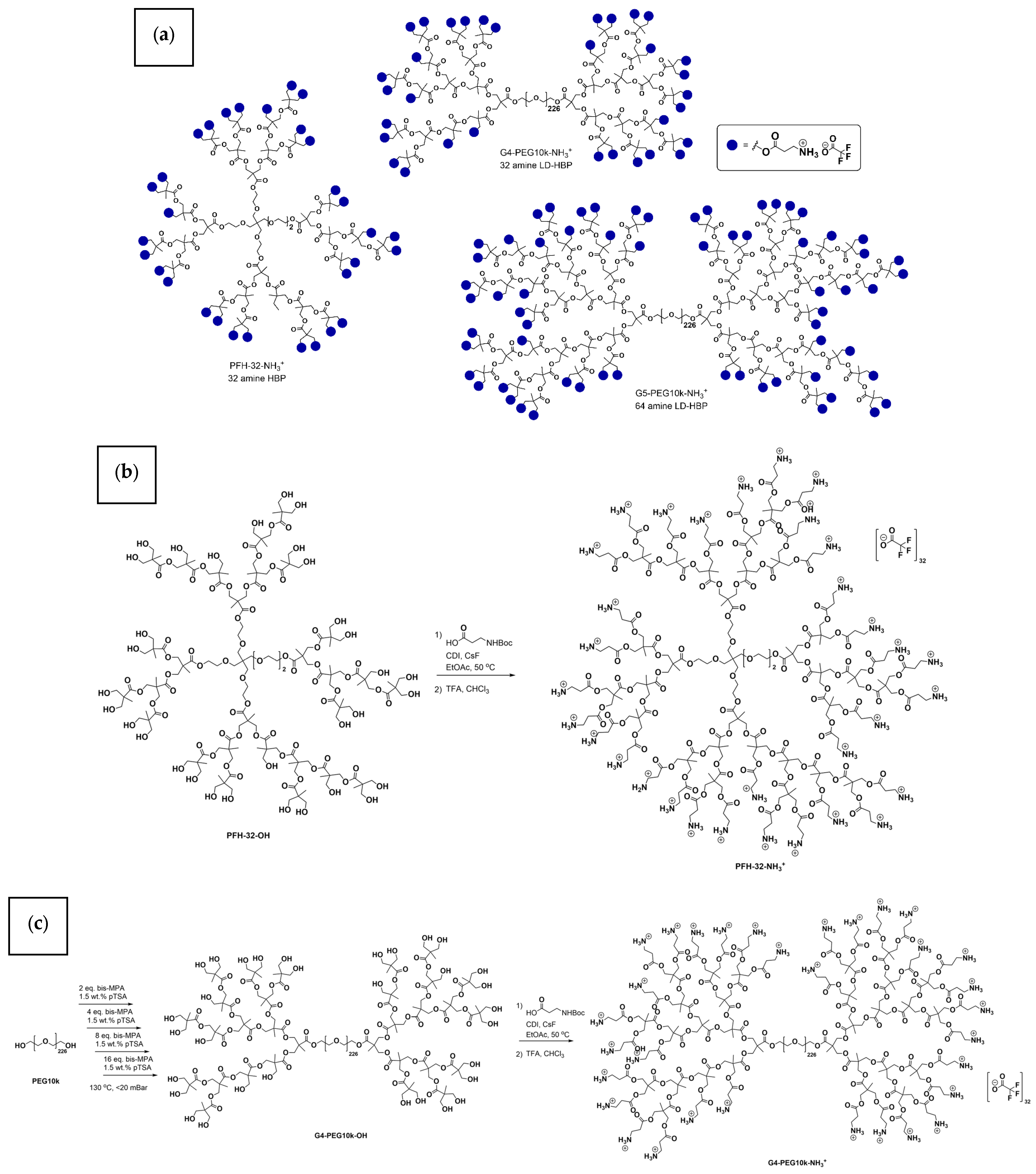 | PFLDHB-G4-PEG10k-NH3+ | LD-HBP | 4 | Amine | 32 | 28.5 | 19,400 | 18,600 |
