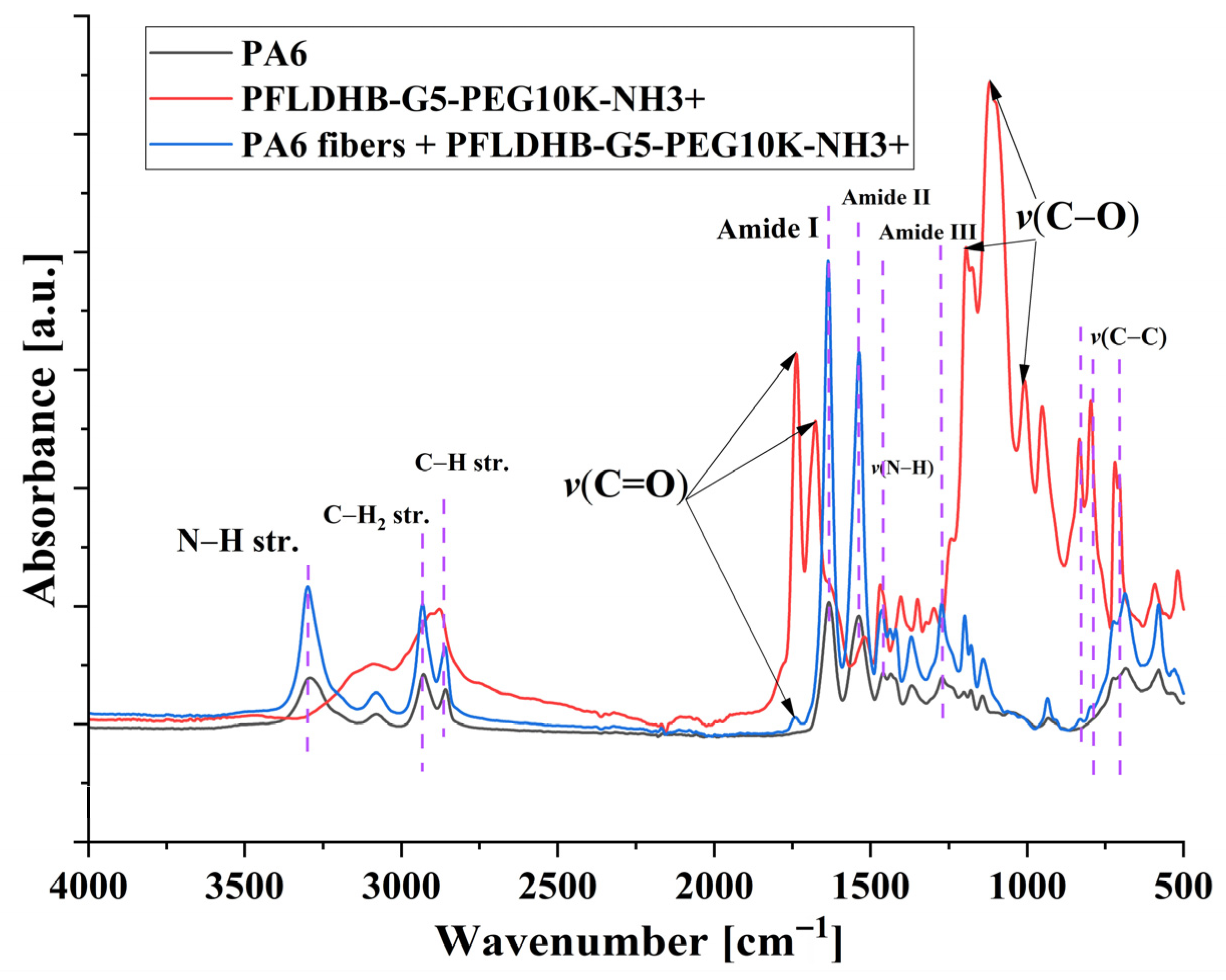 | MB47.3 | PA6 + 3 wt.% PFLDHB PEG10k-G4-NH3 | 37.65 | 99.79 | 41.26 | 99.90 | 38.64 | 99.81 |