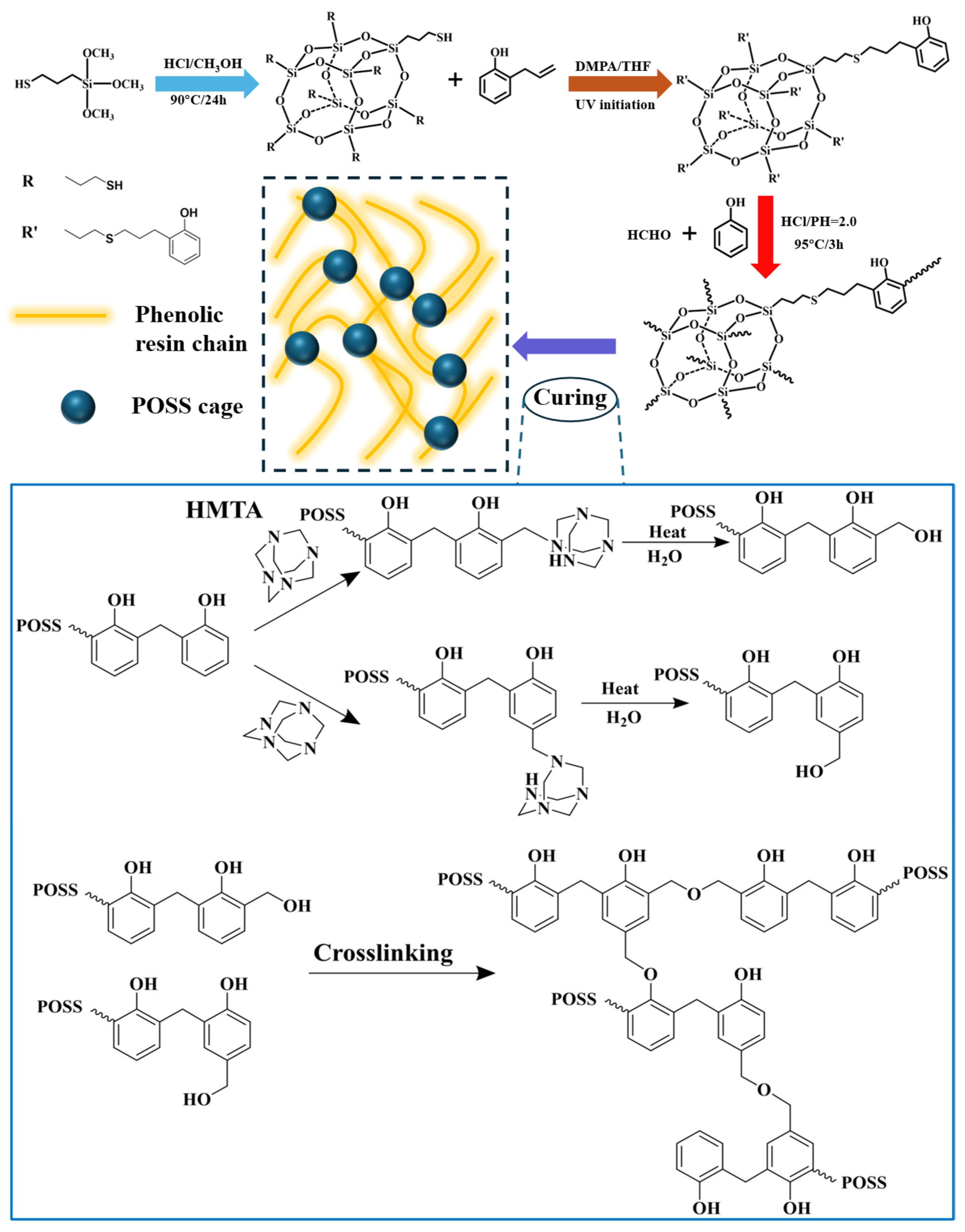 - Wang, B.; Shi, M.; Ding, J.; Huang, Z. Polyhedral oligomeric silsesquioxane (POSS)-modified phenolic resin: Synthesis and anti-oxidation properties. e-Polymers 2021, 21, 316–326. [Google Scholar] [CrossRef]