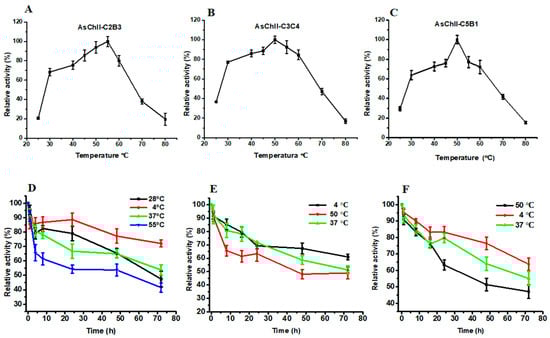 Effects of temperature on enzymatic activity and thermostability of chitinases AsChtII-C2B3, AsChtII-C3C4, and AsChtII-C5B1. (A–C) Effect of temperature on the relative activity of AsChtII-C2B3 (A), AsChtII-C3C4 (B), and AsChtII-C5B1 (C), measured at temperatures ranging from 25 to 80 °C. (D–F) Thermostability of AsChtII-C2B3 (D), AsChtII-C3C4 (E), and AsChtII-C5B1 (F), determined by measuring residual activity after incubation at different temperatures (4, 28, 50, 37, and 55 °C) for up to 72 h. Relative activity is expressed as a percentage of the initial activity (100%). The activities of each enzyme were measured at its optimal pH with colloidal α chitin as the substrate. The highest activity of each enzyme was defined as 100%. The graphs show data from triplicate experiments (mean ± SD).