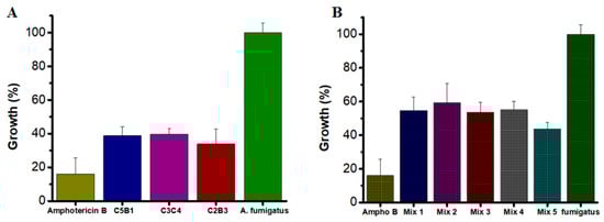 Growth of A. fumigatus in the presence of recombinant chitinases. (A) Individually: AsChtII-C5B1 and AsChtII-C2B3 at 50 µg/mL, AsChtII-C3C4 at 25 µg/mL (B) Synergistic interactions between chitinase. The control P. pastoris KM71H transformed with an empty pPICZαA was tested under the same conditions, and the values obtained for each dilution were subtracted from the values obtained for the chitinases. The results presented were obtained from the mean of the quadruplicate for each sample, with standard deviations included.