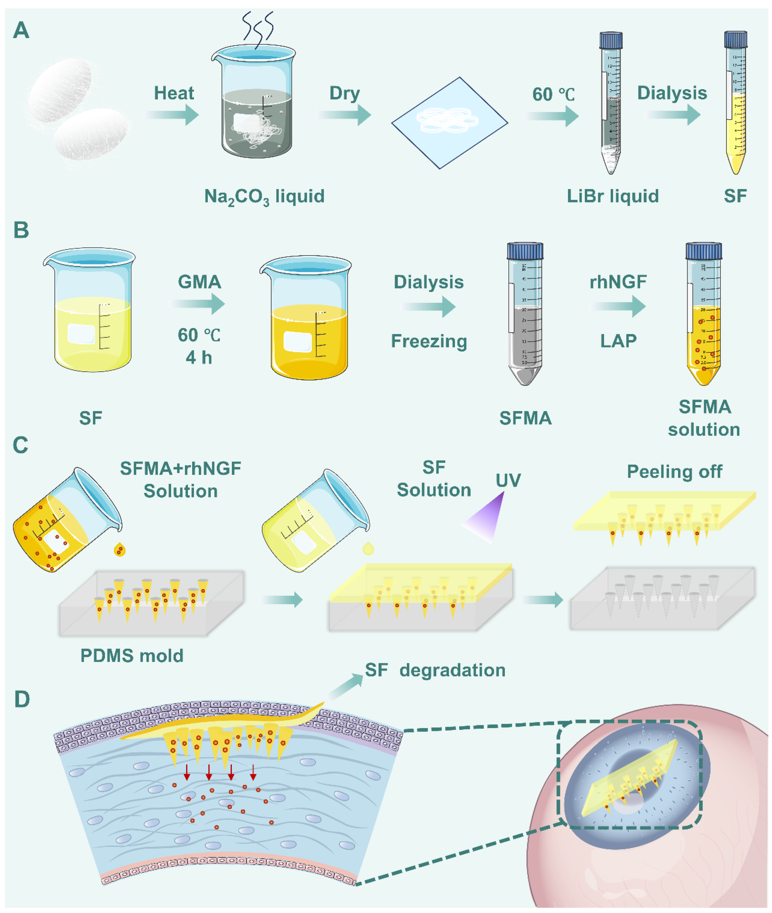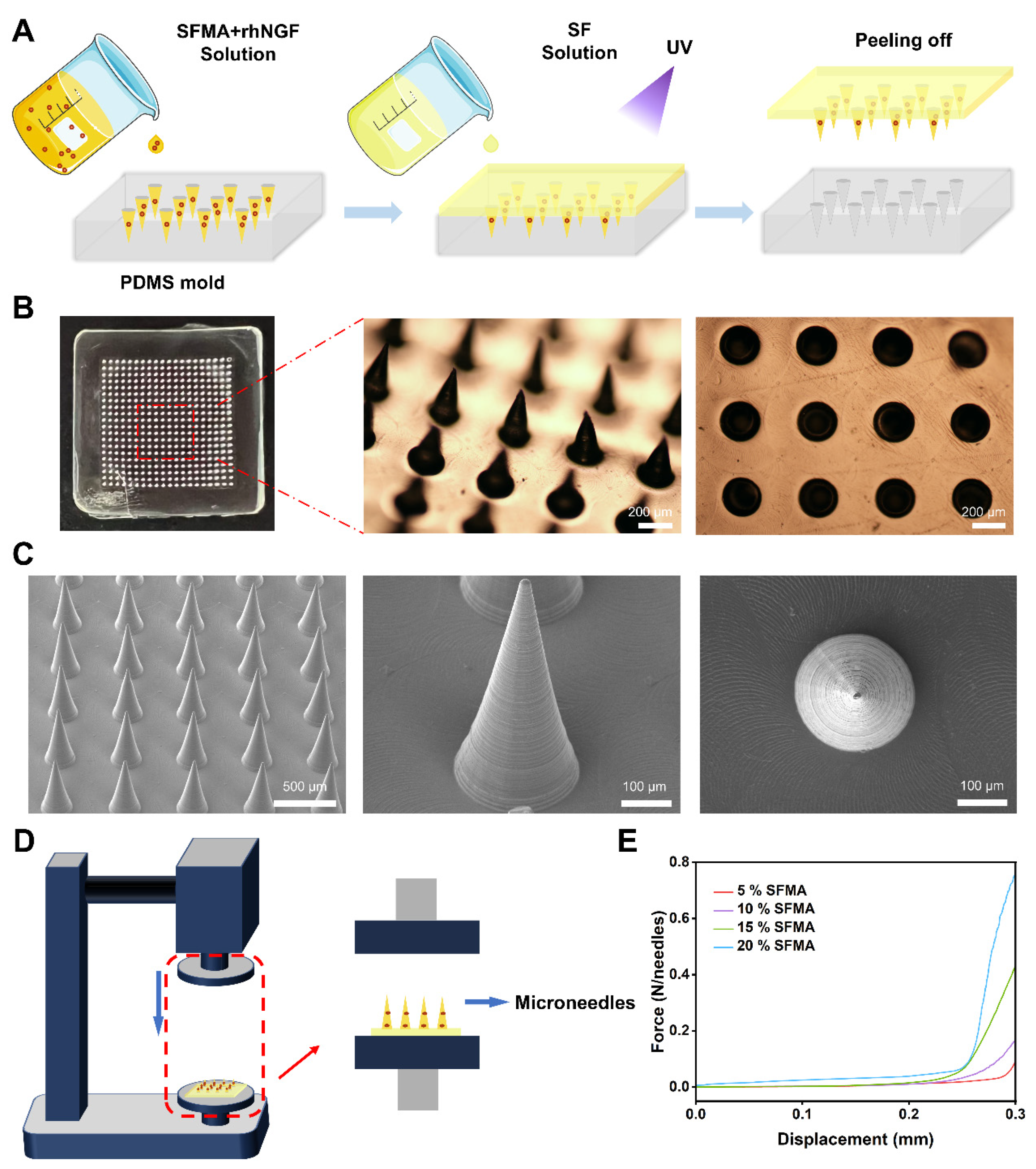 Figure 1B). For microneedle fabrication, SFMA was mixed with rhNGF and poured into a polydimethylsiloxane (PDMS) mold. After degassing in a vacuum chamber, excess SFMA/rhNGF solution was scraped off and recovered. UV crosslinking was performed, after which the bottom was filled with SF solution and dried overnight at 60 °C to complete the system (