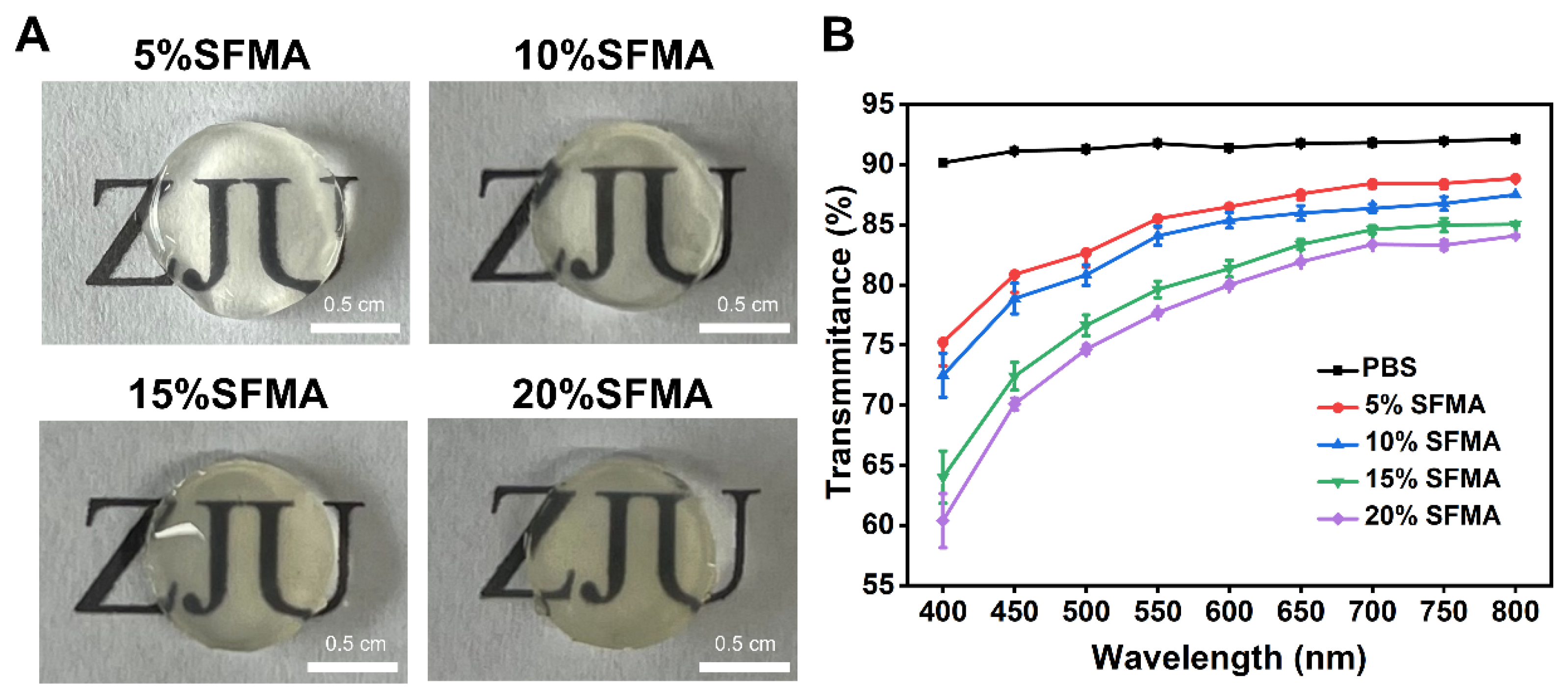 Figure 3B). This suggests that SFMA hydrogels possess excellent optical transparency alongside sufficient mechanical strength, highlighting their broad potential for application in corneal implants.
