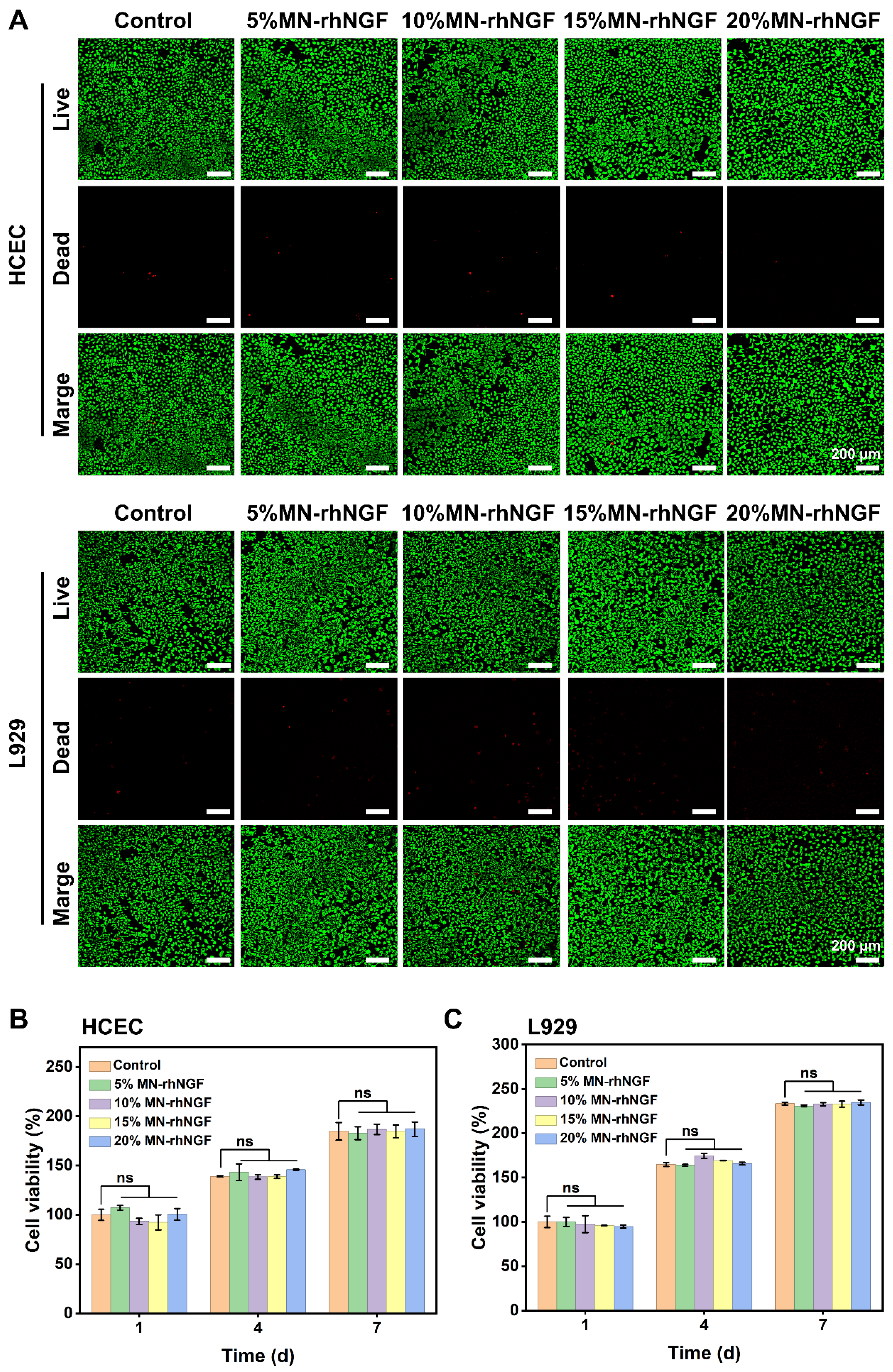 Figure 5A). CCK-8 assay results further confirmed these observations. Cell viability was measured on days 1, 4, and 7, with the absorbance of the control group on day 1 normalized to 100%. Throughout the culture period, no statistically significant difference in cell viability was found between any MN-rhNGF concentration group and the control group for either HCECs or L929 cells (