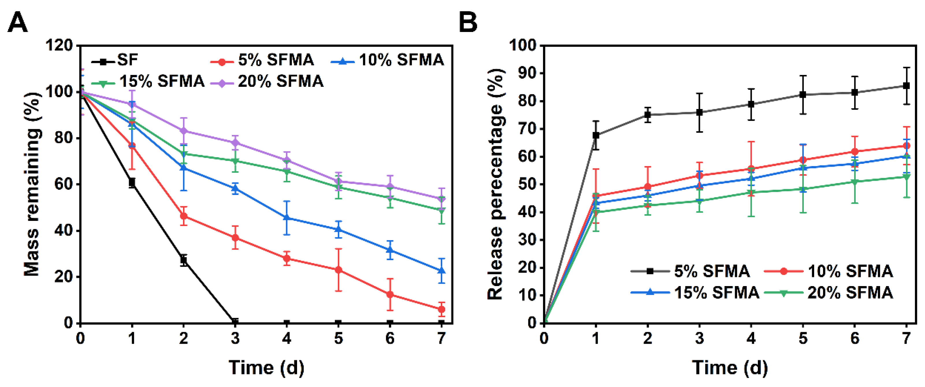 39]. Specifically, 0.1 mL of FITC-BSA was incorporated into SFMA pre-gels of varying concentrations, followed by photo-crosslinking and subsequent immersion in PBS. The cumulative release over a 7 days period was quantified using the fluorescence detection module of a microplate reader. The results demonstrated that the drug-loaded SFMA hydrogels exhibited a characteristic biphasic release profile, comprising an initial burst release phase within the first 24 h, followed by a sustained, linear slow-release phase from days 2 to 7. This release mechanism can be attributed to two release processes: the first release stage diffusion-mediated burst release of surface-associated drug molecules through the hydrogel network, and the second release stage sustained release of the encapsulated payload concurrent with hydrogel matrix degradation (