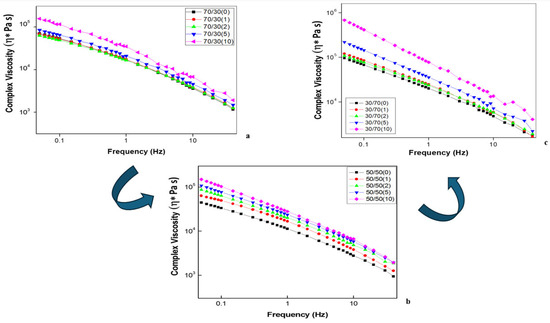 The complex viscosities, η*, of the prepared NR/NBR 70/30 blend nanocomposites (up to 10 phr nanoclay content) are shown in Figure 1a–c.