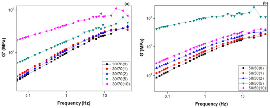 Figure 2a,b show the storage modulus, G’, as a function of the frequency for the 50/50 and 30/70 systems, which were those that suggested, from the viscosity curves, higher degrees of matrix–filler interaction. In fact, the significant increase in the storage modulus with the nanoclay content suggests an increased solid-like behaviour through the formation of physical connectivity or a percolated network between clay layers [43]; this is further confirmed by the reduced slope at lower frequencies which indicates an increased elastic behaviour on increasing the nanoclay content [44,45].