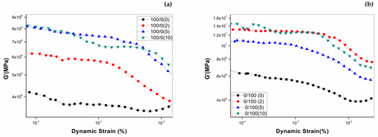 Storage modulus vs. dynamic strain curves for 100/0 (a) and 0/100 (b) NR/NBR blends with different filler loadings.