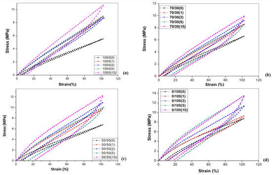 Effect of nanoclay content on single loading–unloading cycles on 100/0 (a), 70/30 (b), 50/50 (c), and 0/100 (d) NR/NBR nanocomposites at a constant strain of 100%.