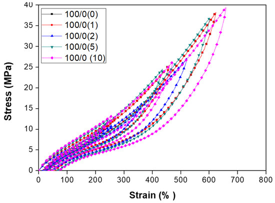 Stress–strain and hysteresis tests were performed using a Tinius Olsen H50KT Universal Testing Machine (Tinius Olsen Inc., Horsham, PA, USA, supplied by AIMIL Ltd., New Delhi, India) controlled by Test Navigator software. Dumbbell-shaped (ASTM D1708) [39] NR/NBR blend nanocomposite vulcanizates with 2 mm thickness were used. Samples were stretched and released with a 500 mm/min crosshead speed. The three-cycle hysteresis behaviours of blend nanocomposites were investigated by stretching them to 200 or 300% elongation and immediately releasing (unloading). Consecutive hysteresis cycles were initiated after the crosshead returned to the original starting position.