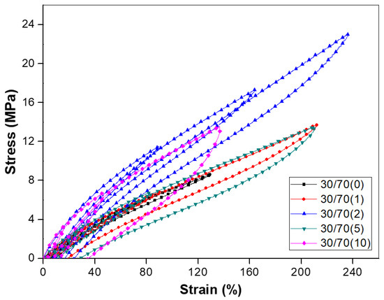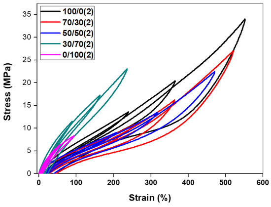 To assess the effect of blend composition, hysteresis loss at different strain levels was plotted for composites with a specific filler content, i.e., 2 phr nanoclay. The hysteresis curves of the nanocomposites at different blend compositions are shown in Figure 9. The cycle area and, therefore, the dissipated energy was significantly different among the investigated systems and increased on increasing the NR fraction.