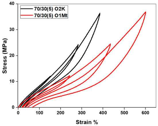 To evaluate the possible influence of different nanoclay modifications, i.e., the Cloisite hereafter labelled as O1Mt, on the hysteresis loss, Figure 10 shows the hysteresis cycles of a 70/30 NR/NBR nanocomposite with the two different nanoclays. It can be observed from the figure that for the blend nanocomposite with mercapto silane modification, the area of the hysteresis loop is smaller. This could be due to the stronger interaction between O2K and NR and the enhanced cross-linking caused by the mercapto silane group. The area inside the loop is given in Table 6 (anticipated in Section 3.4) for further clarification.