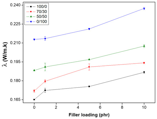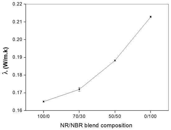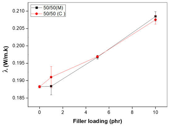 Finally, to evaluate the possible influence of different nanoclay modifications, the thermal conductivity values of the 50/50 NR/NBR blend nanocomposite with the two different nanoclays were observed and are provided in Figure 14. It was found that the thermal conductivity is not much affected by the clay modification.