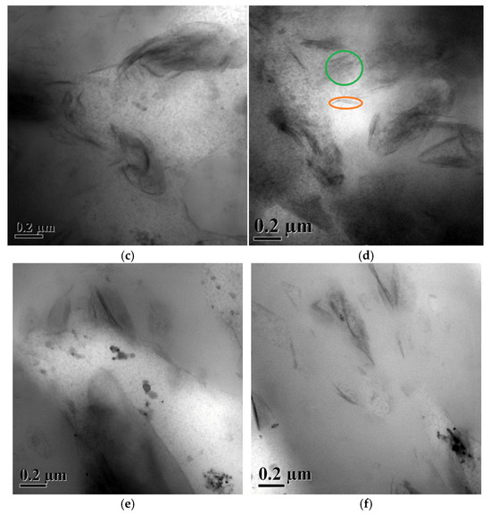 TEM images of 70/30 (10) NR/NBR blend nanocomposites (a,b); 50/50 (10) NR/NBR blend nanocomposites (c,d) with green and orange ovals highlighting intercalated and exfoliated morphology, respectively; (e,f) 30/70 (10) NR/NBR blend nanocomposites.