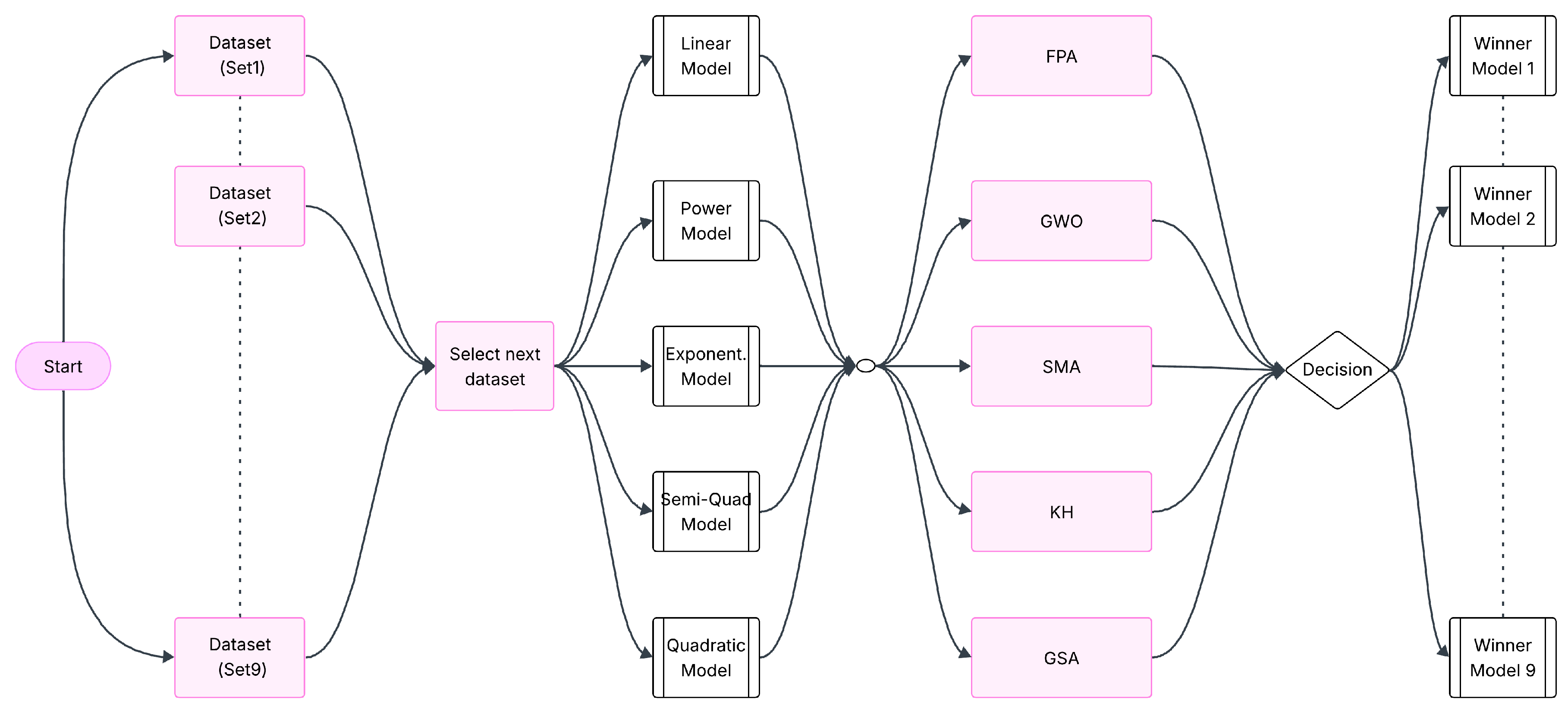 To capture the heterogeneity of the material behavior, the raw experimental dataset (N = 27) was initially stratified into three distinct subsets (S1, S2, S3). To foster model diversity, six training combinations were derived from these subsets (e.g., S1, S1 ∪ S2, etc.). For each combination, a specific empirical mathematical model was selected. The GWO algorithm was employed as the parameter estimation technique, utilizing a fitness function defined by the minimization of the MAPE for the respective training set. This resulted in six optimized ‘Base Learners’ (M1 … M9), each specialized in different regions of the data topology.