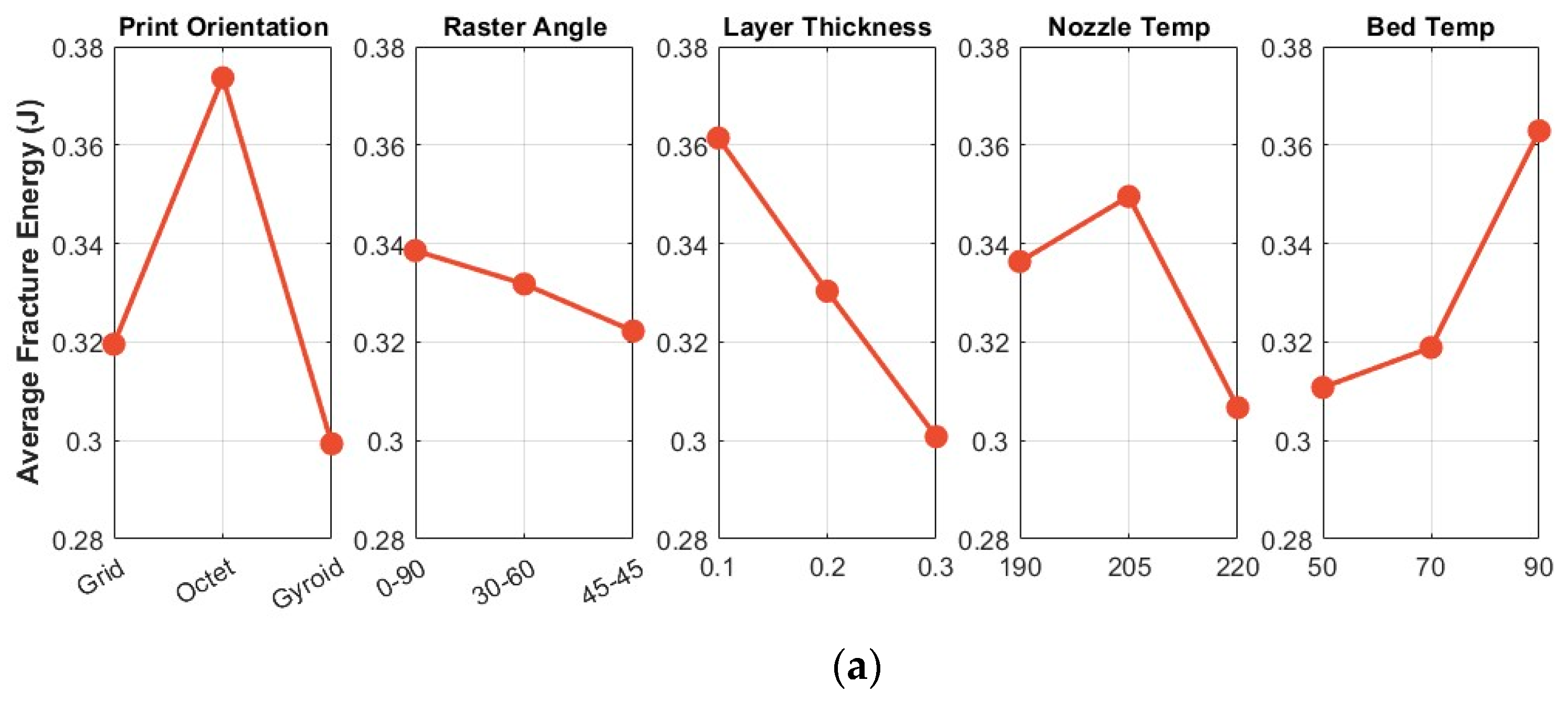 The Taguchi analysis identifies print orientation as the most critical factor (Rank 1) for enhancing the fracture properties of FDM-printed PLA, followed by layer thickness and bed temperature as significantly influential parameters. While nozzle temperature maintains a measurable impact, the raster angle was found to contribute the least to the overall fracture energy. As summarized in