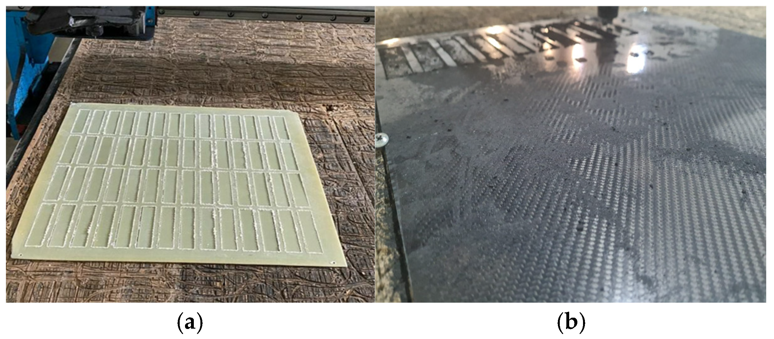Prepreg production was performed with a drum-type machine, and the fiber-reinforced sheets were manufactured by Fibermak Engineering Company, located in İzmir, Turkey. The composite laminates were cut into 500 mm × 500 mm sheets using CNC machining, and the final laminate thickness was set to 2 mm (