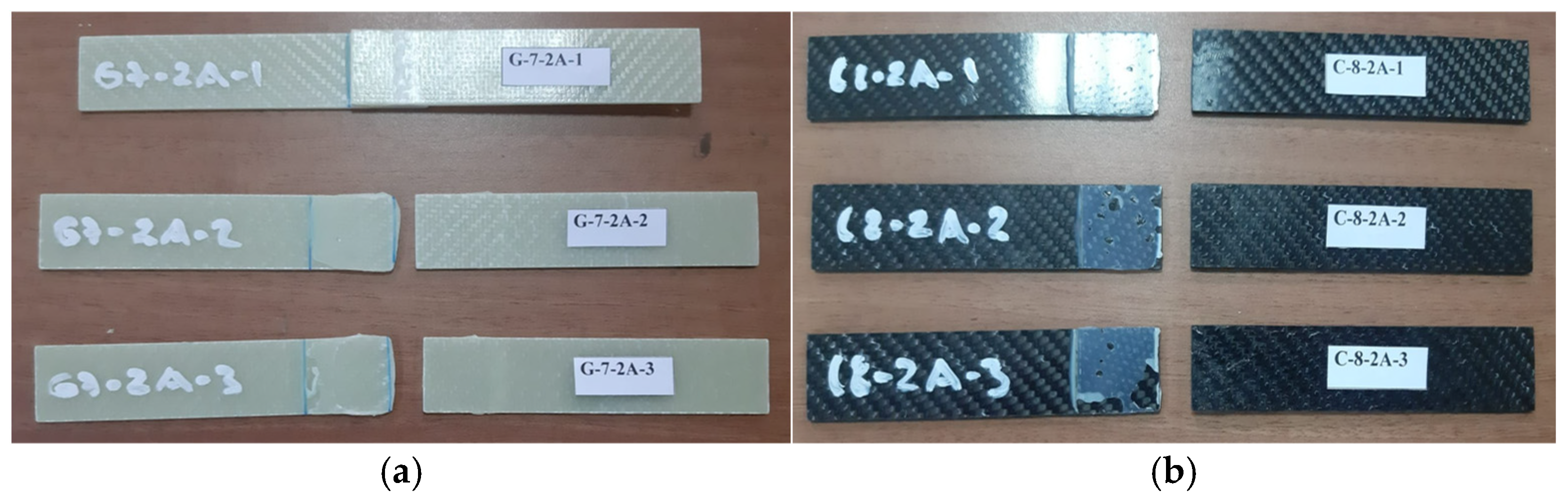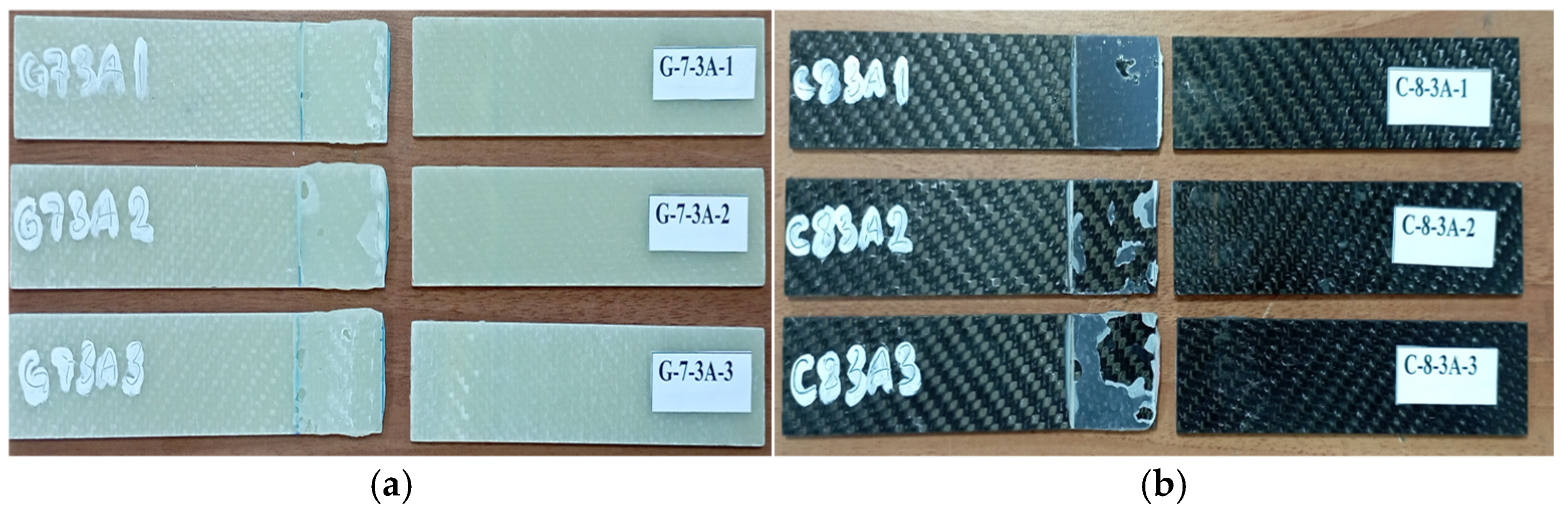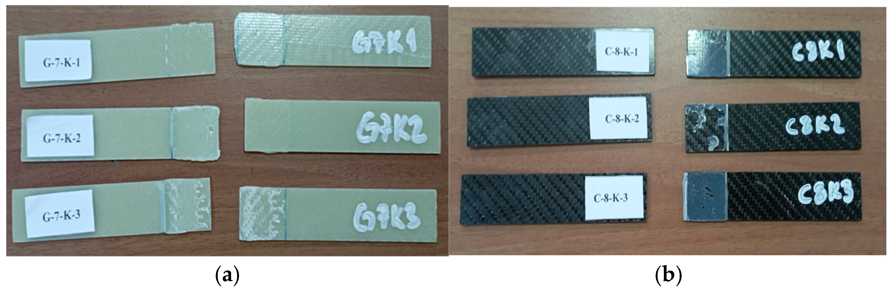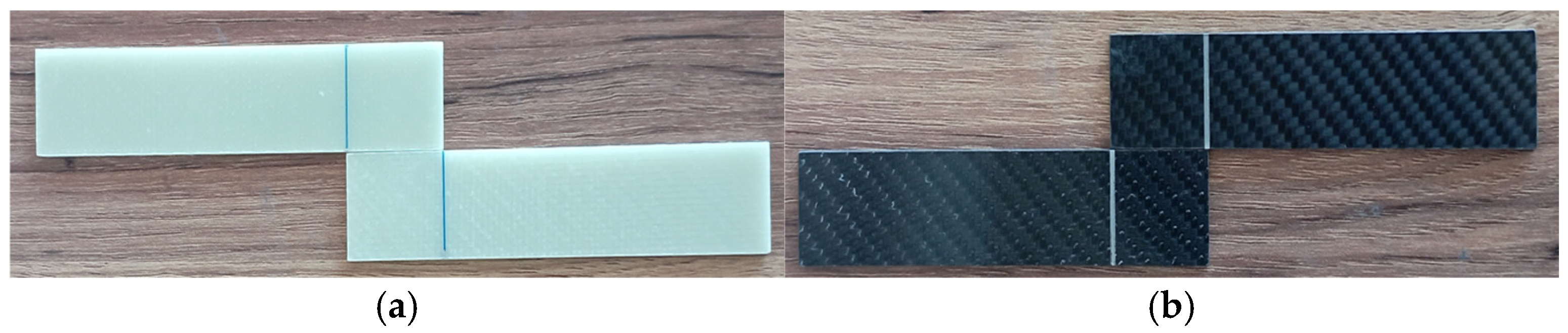 This is attributed to the fact that thin layers provide more effective mechanical resistance. After bonding, the samples were cured at room temperature for 7 days, in accordance with the product data sheet, and then moved on to the testing phase. This is attributed to the thin adhesive layers’ ability to support mechanical loads more effectively. Application was carried out under a constant pressure of 0.1 MPa and a target thickness of 0.2 mm; the evenness of the adhesive layer was confirmed by measuring it with a digital caliper.