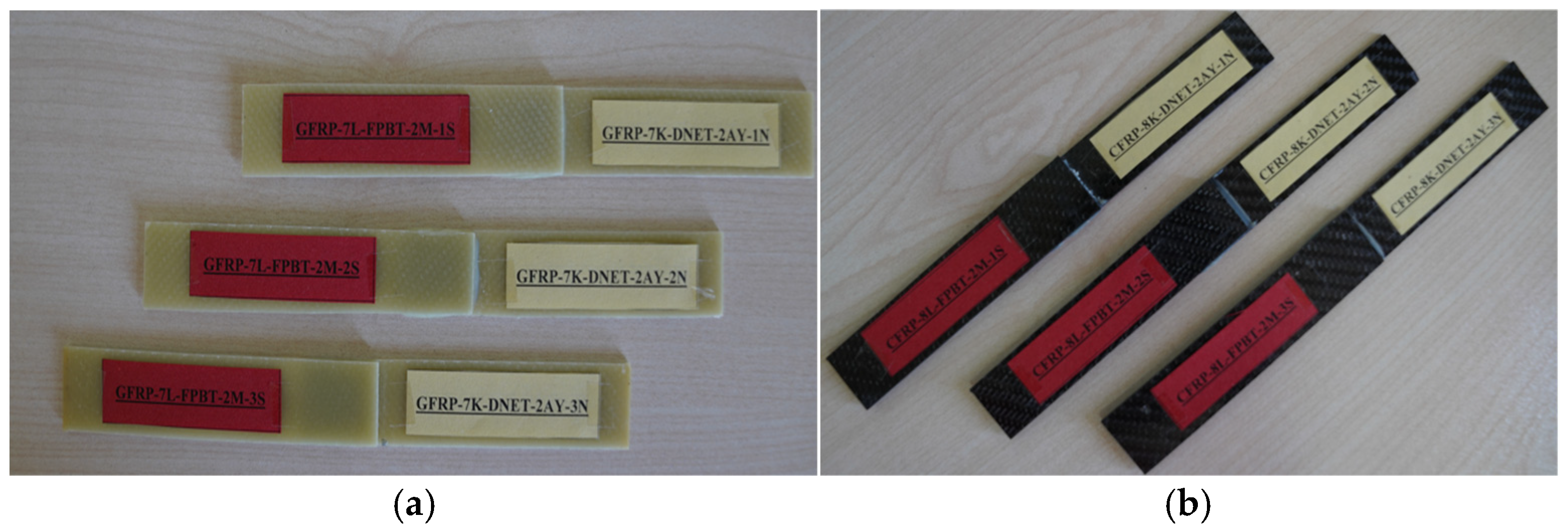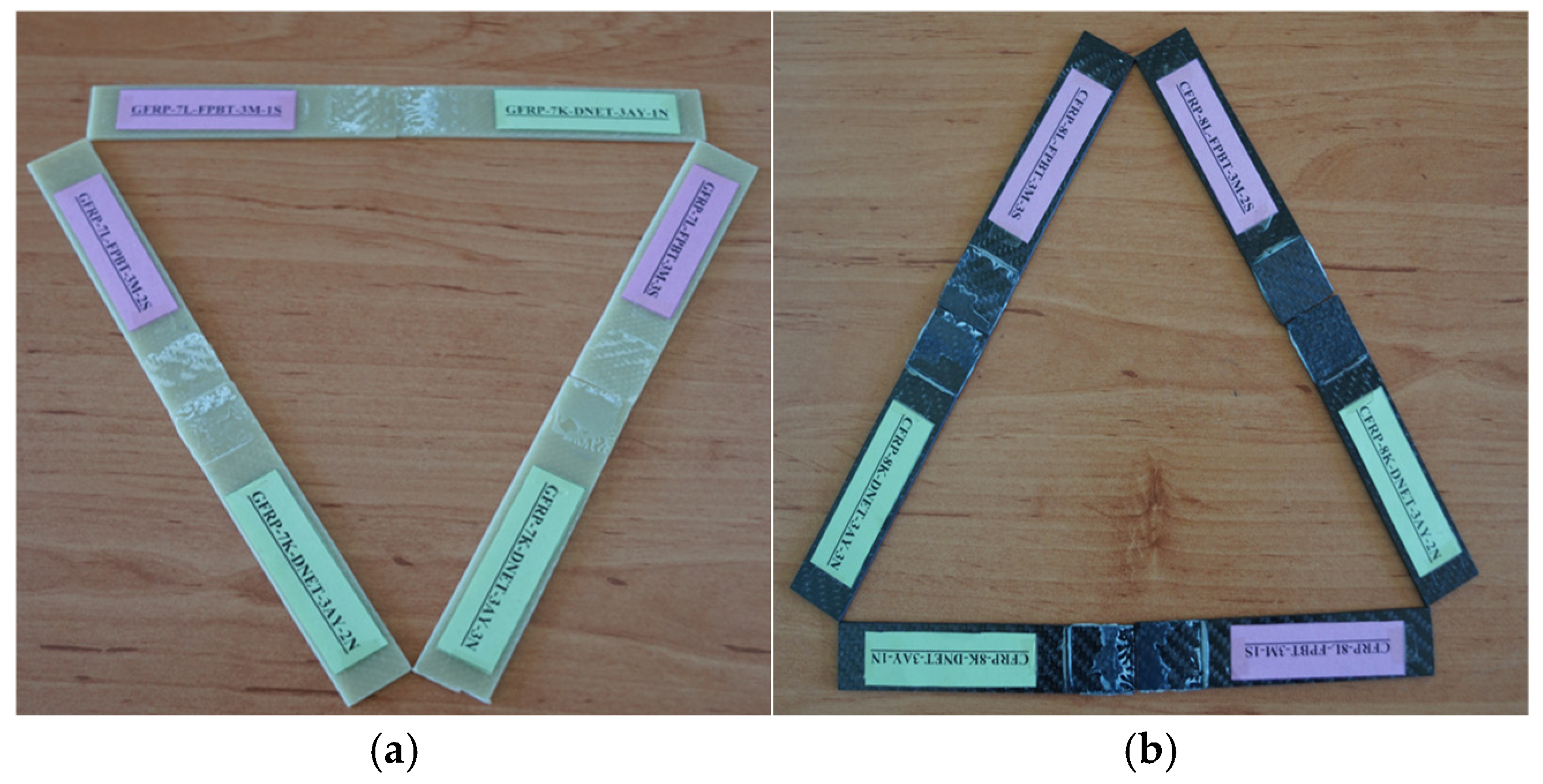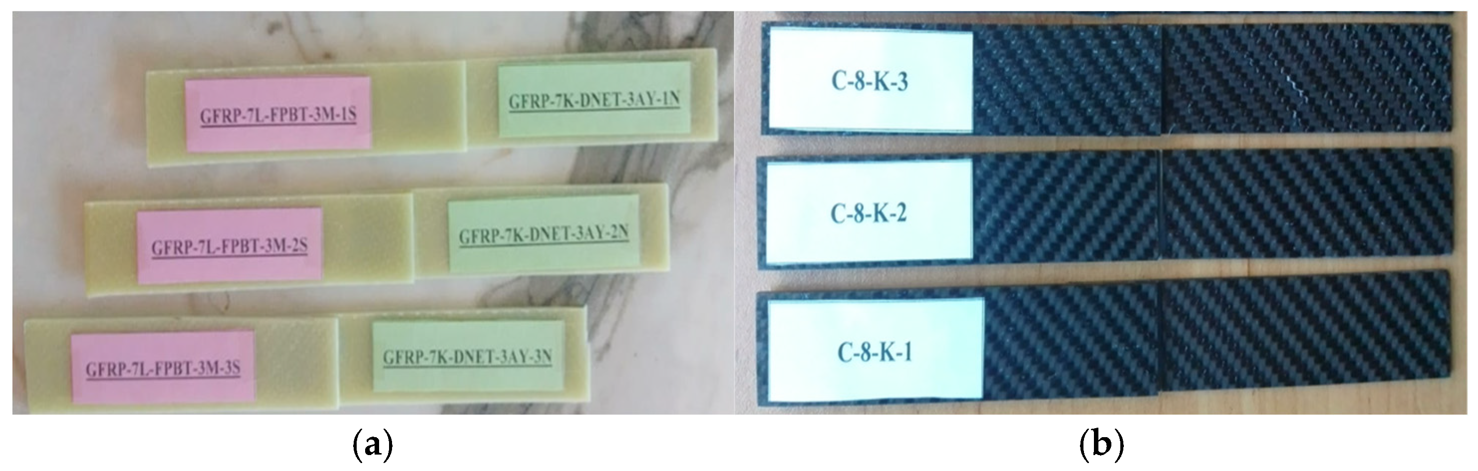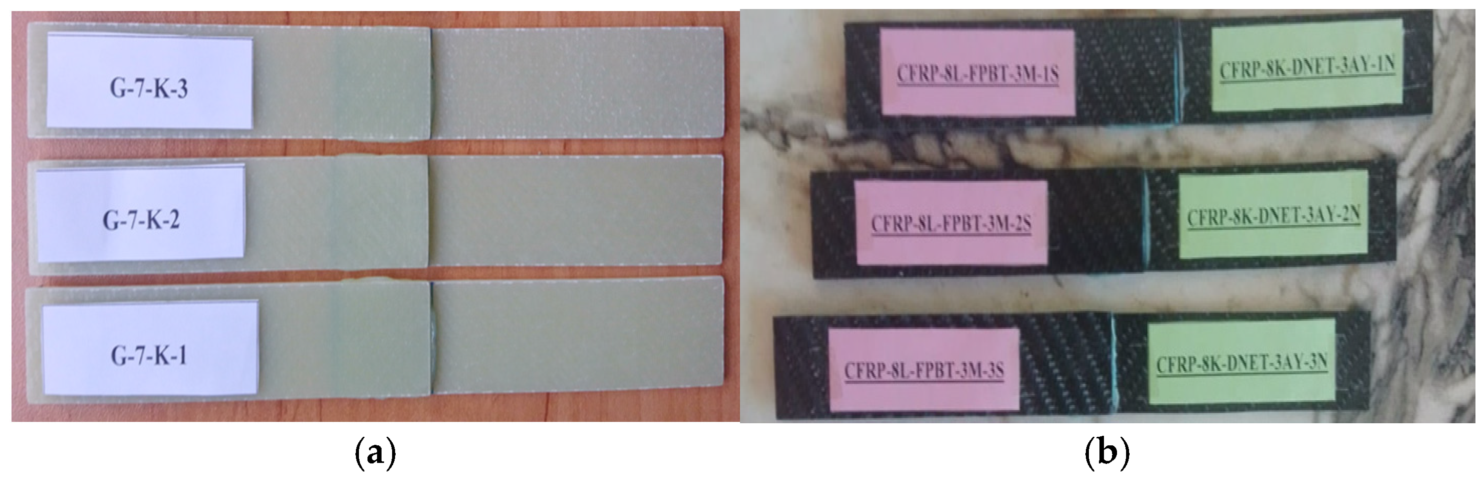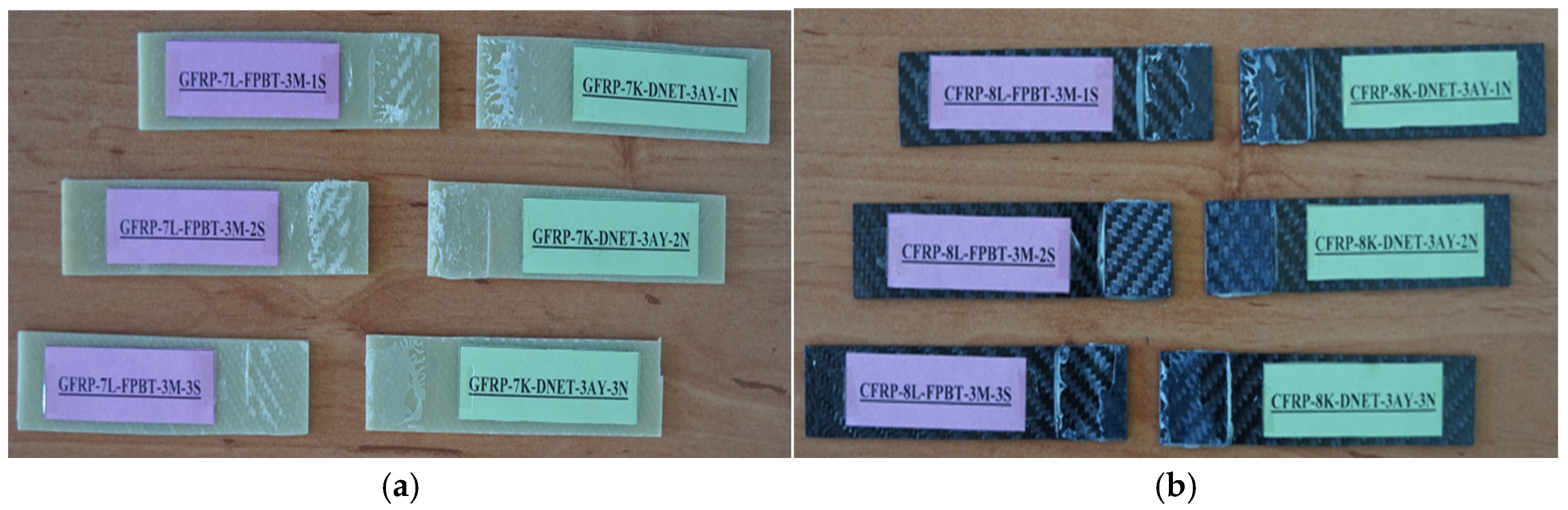 General views of the surface areas of the GFRP and CFRP samples bonded with Loctite Hysol-9466 epoxy adhesive before the three-point and four-point bending tests are presented in