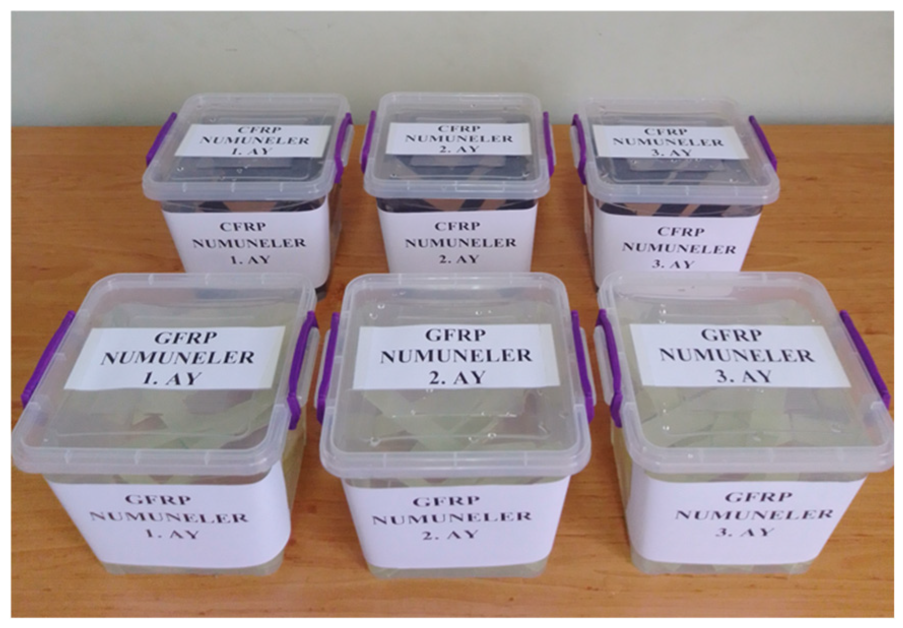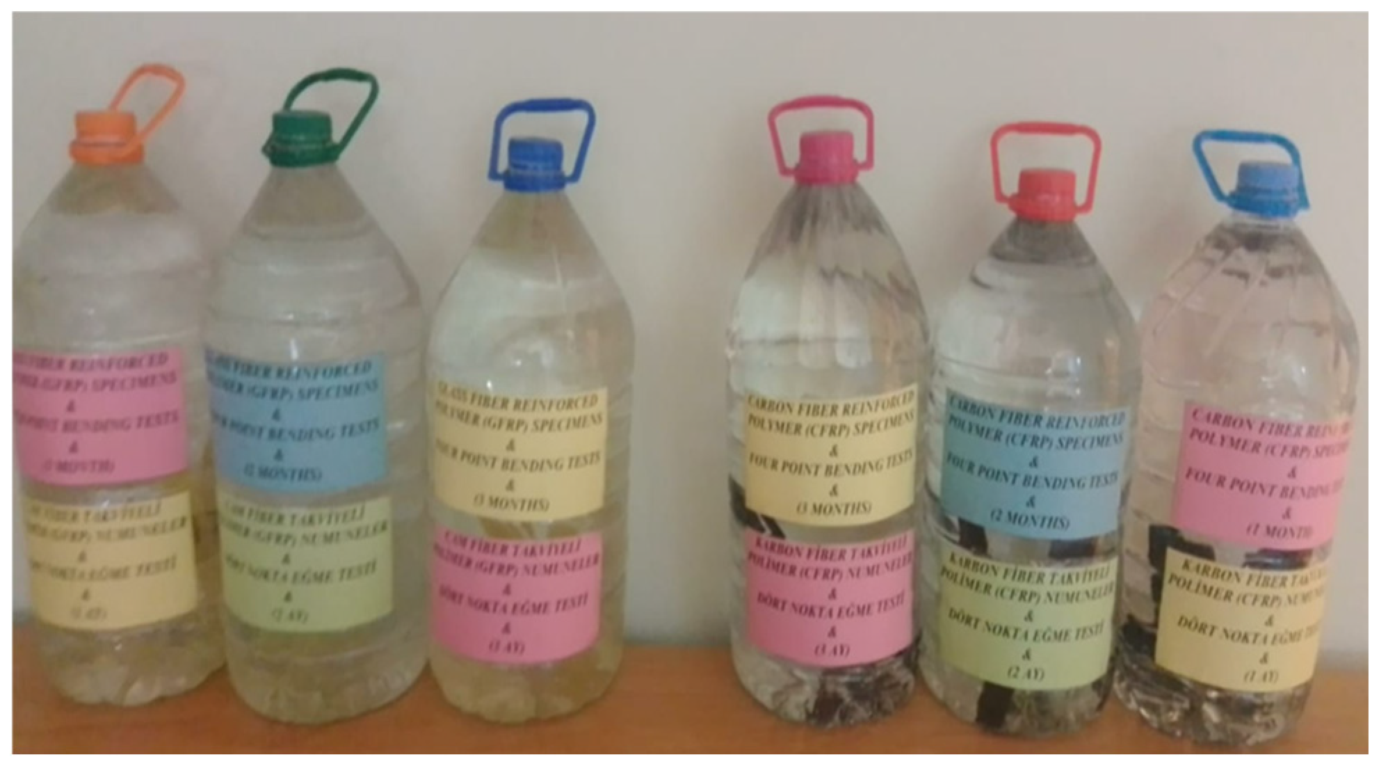 In this study, GFRP and CFRP specimens were stored both under dry conditions and in natural seawater collected from the Aegean Sea (22 °C, 3.3–3.7% salinity) for 1, 2, and 3 months. Their mechanical behavior and damage characteristics were comparatively evaluated through three-point and four-point bending tests.