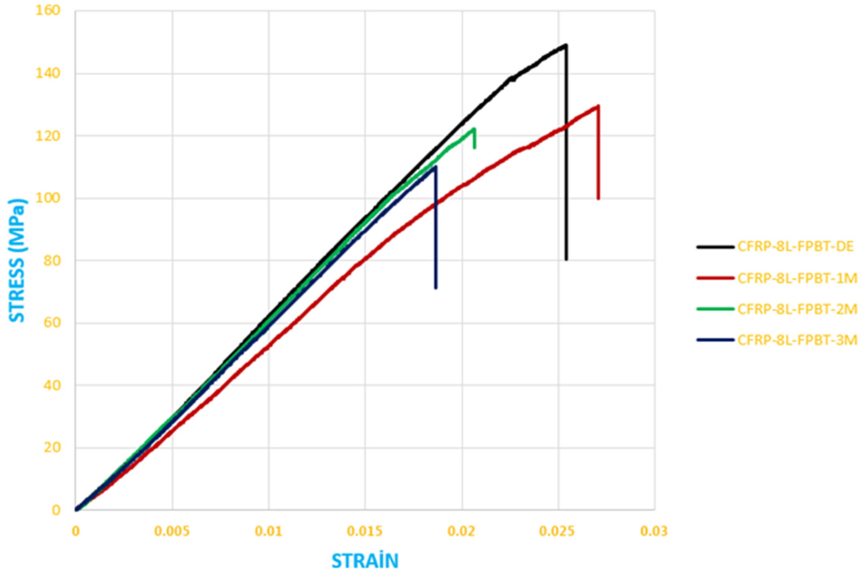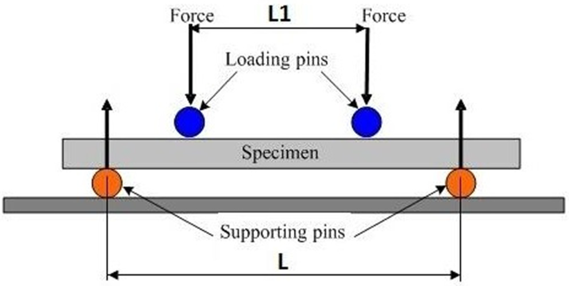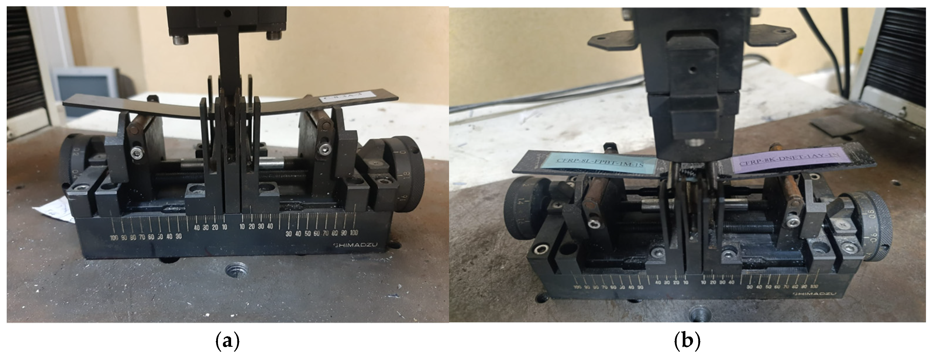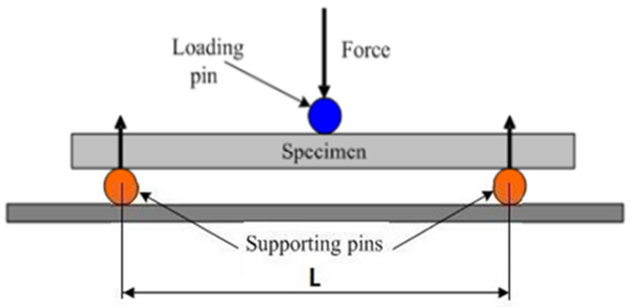 During the three-point bending tests, stress–strain curves were obtained and analyzed based on the experimental data. In the four-point bending tests, parameters such as applied load, test speed, and specimen geometry were defined on the testing system, and measurements were automatically recorded through the test software.