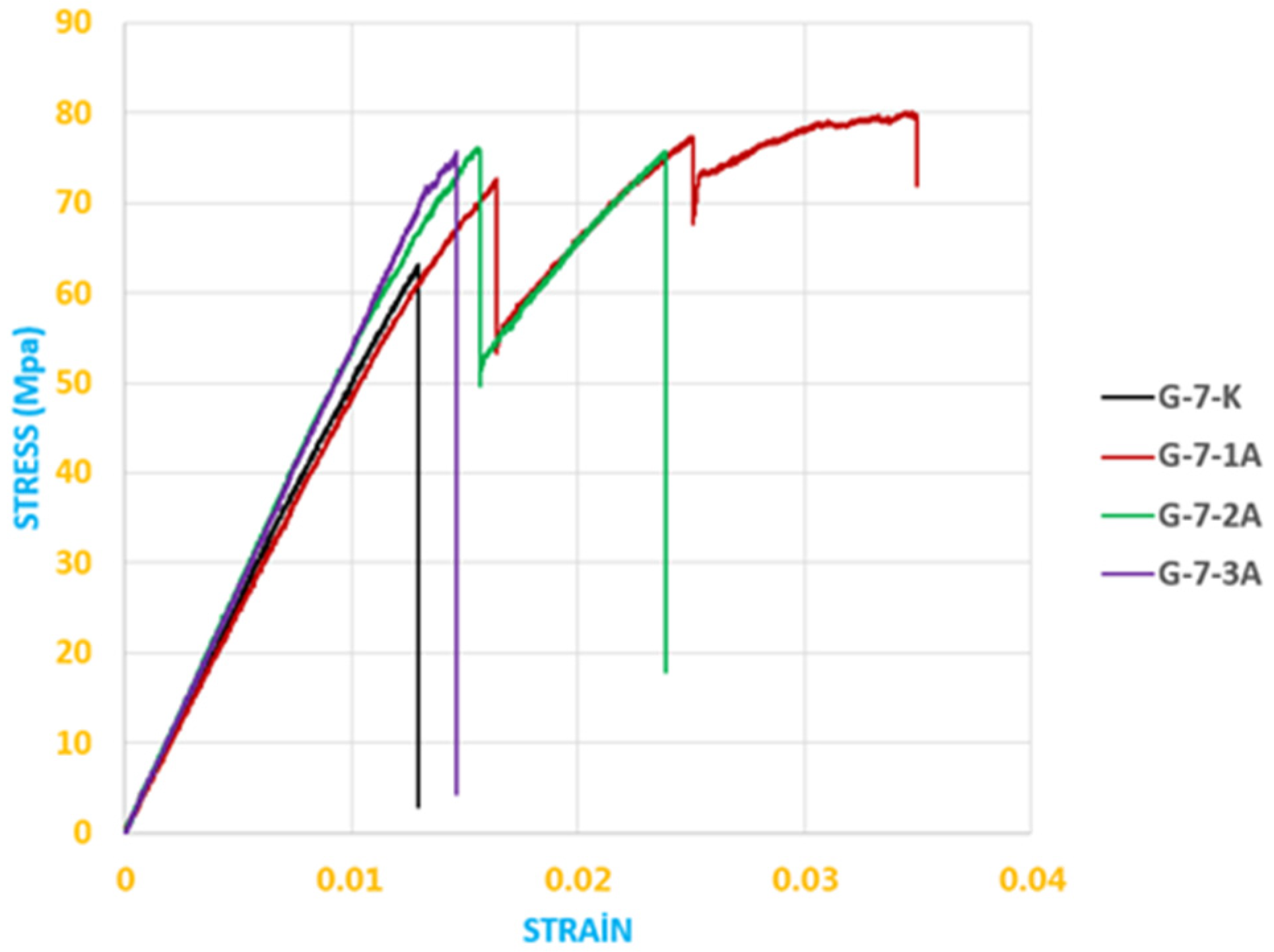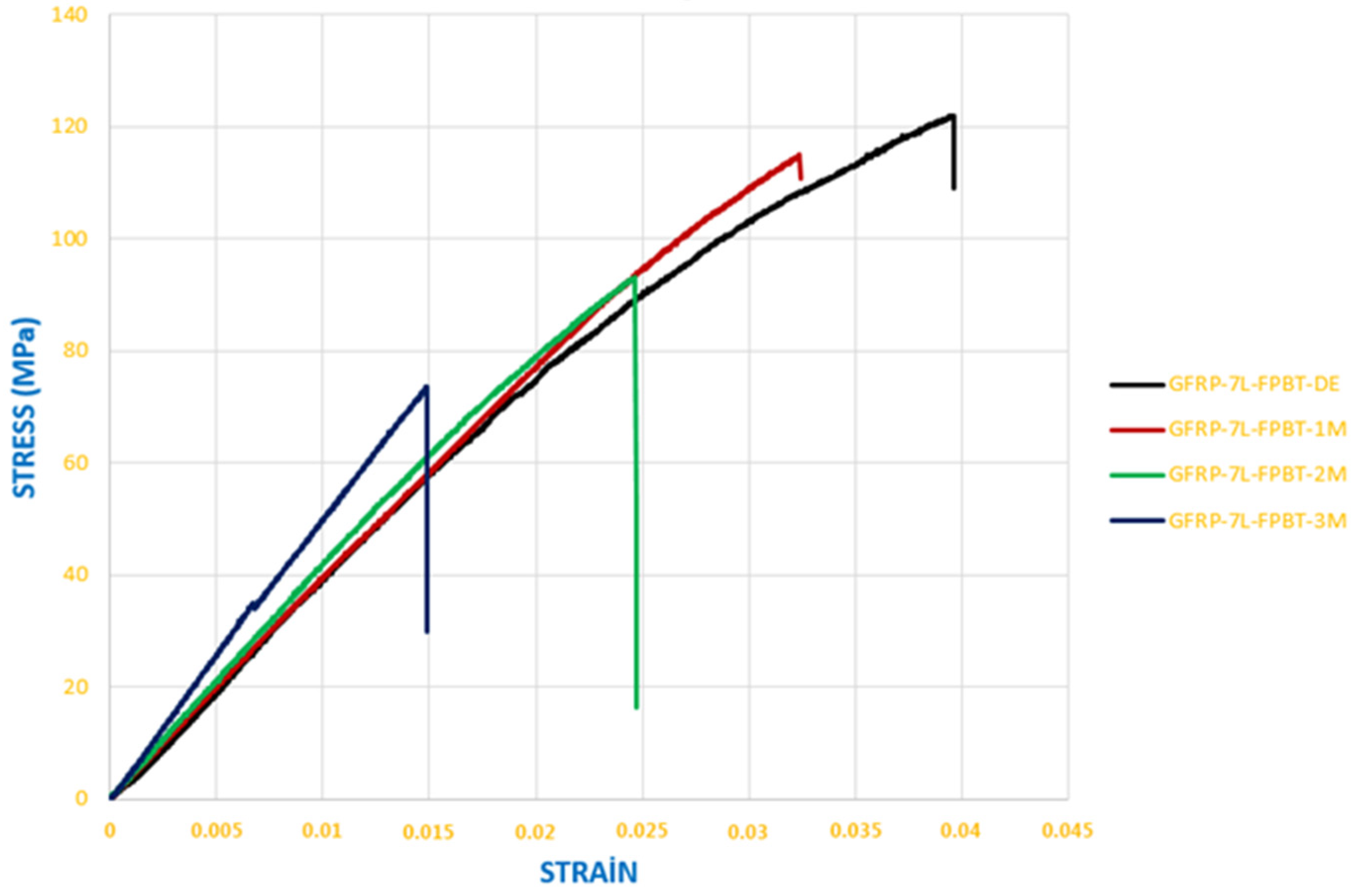 Figure 14). During this test, the maximum stress and strain values occurring at the center of the adhesive-bonded joint specimens were calculated at each load level, allowing for a reliable evaluation of the mechanical performance of the composite joints. Both testing methods provide a systematic and comprehensive approach to analyzing the behavior of different composite materials and bonding parameters under marine environmental conditions.