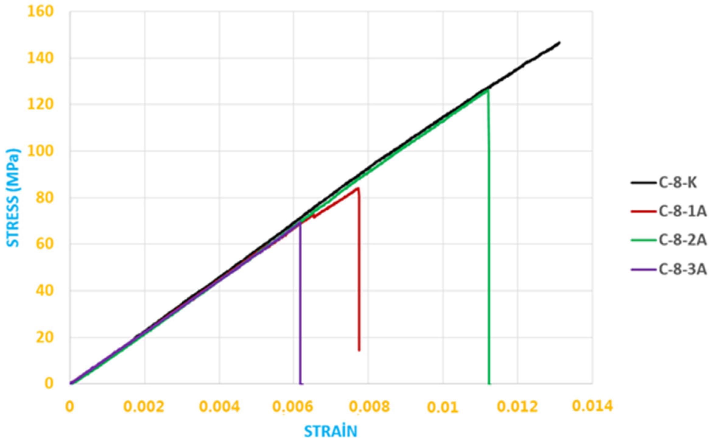 During the test, the stress and strain values at the center of the adhesively bonded joint specimen were determined at each loading step in the four-point bending test, thus evaluating the material’s mechanical performance.