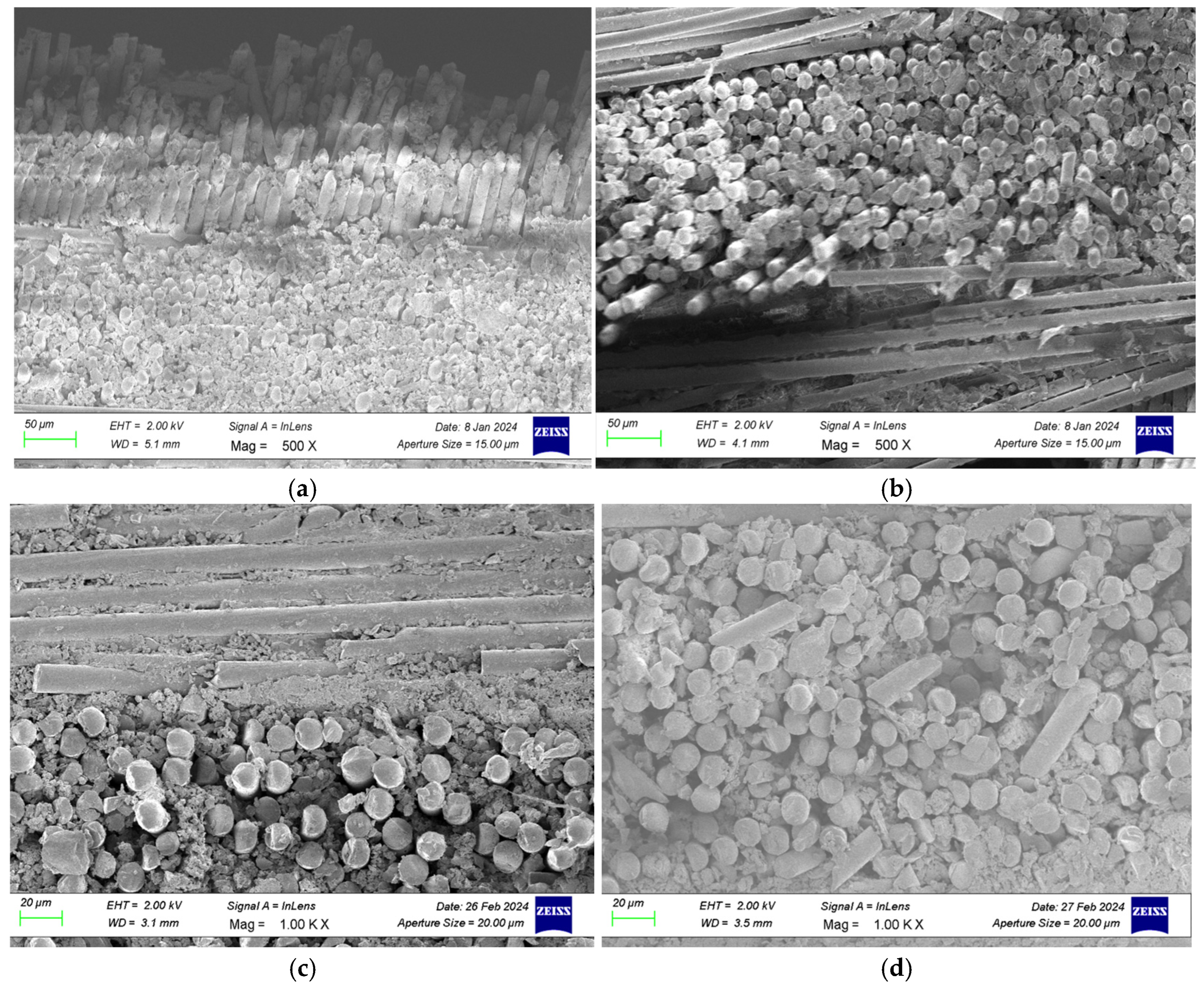 15]. Therefore, understanding the failure mechanisms of bonding surfaces and interface zones in both turbine blades and marine structures is crucial for ensuring long-term performance. The sustainability of structural integrity depends not only on the mechanical properties of the reinforcing fibers and matrix but also on the quality of their interaction, the homogeneity of the interface, and the accuracy of manufacturing techniques. Under dynamic loading, temperature variations, and wind effects, the behavior of the interface plays a decisive role. In particular, fiber orientation directly affects load distribution, shaping the overall performance of the structure [