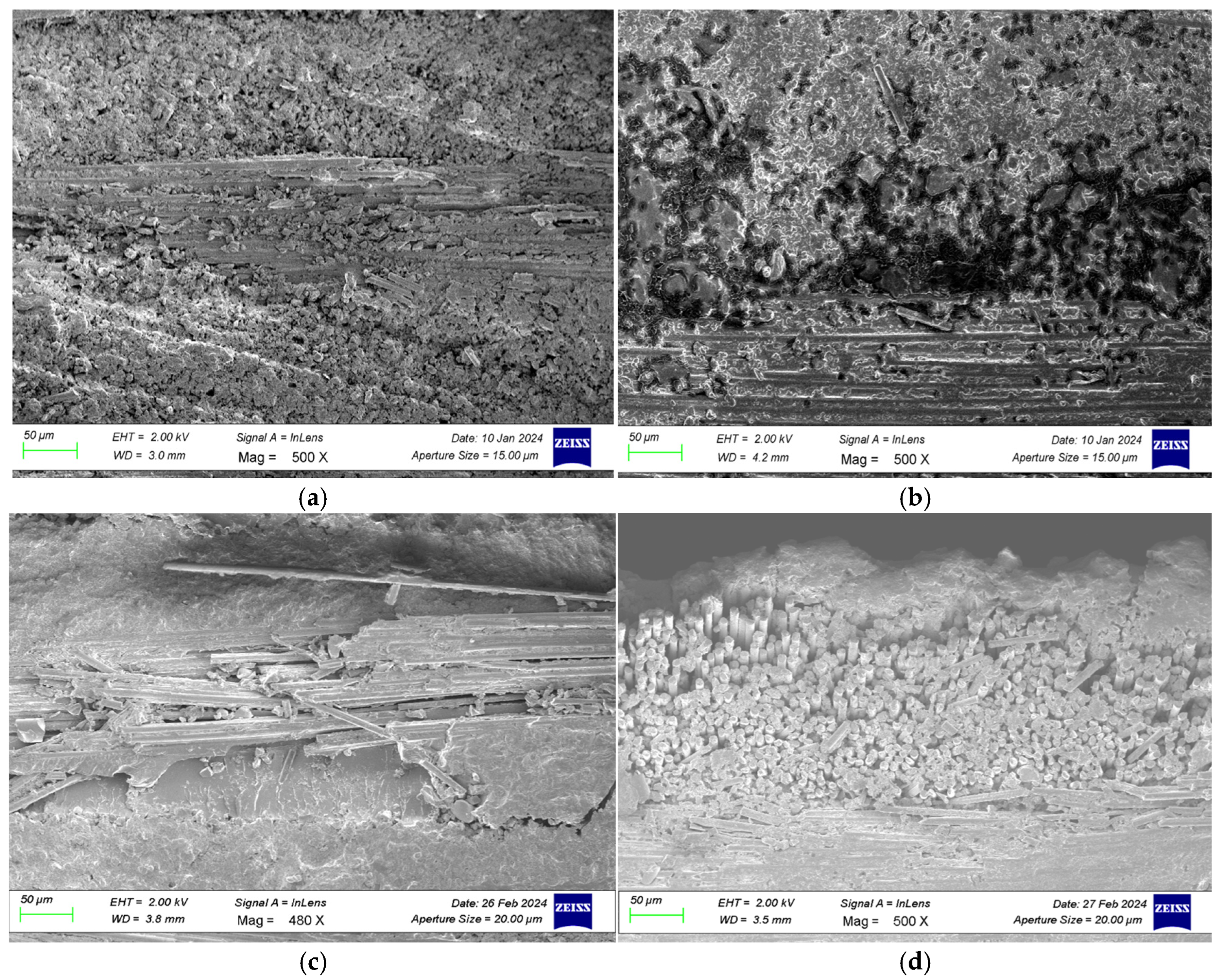 37]. Although polymer matrices provide partial protection to reinforcing fibers, moisture and ions can penetrate the composite through microcracks, voids, and fiber matrix interfaces. Moisture diffusion leads to matrix plasticization, swelling, and hydrolysis, resulting in degradation of mechanical properties [