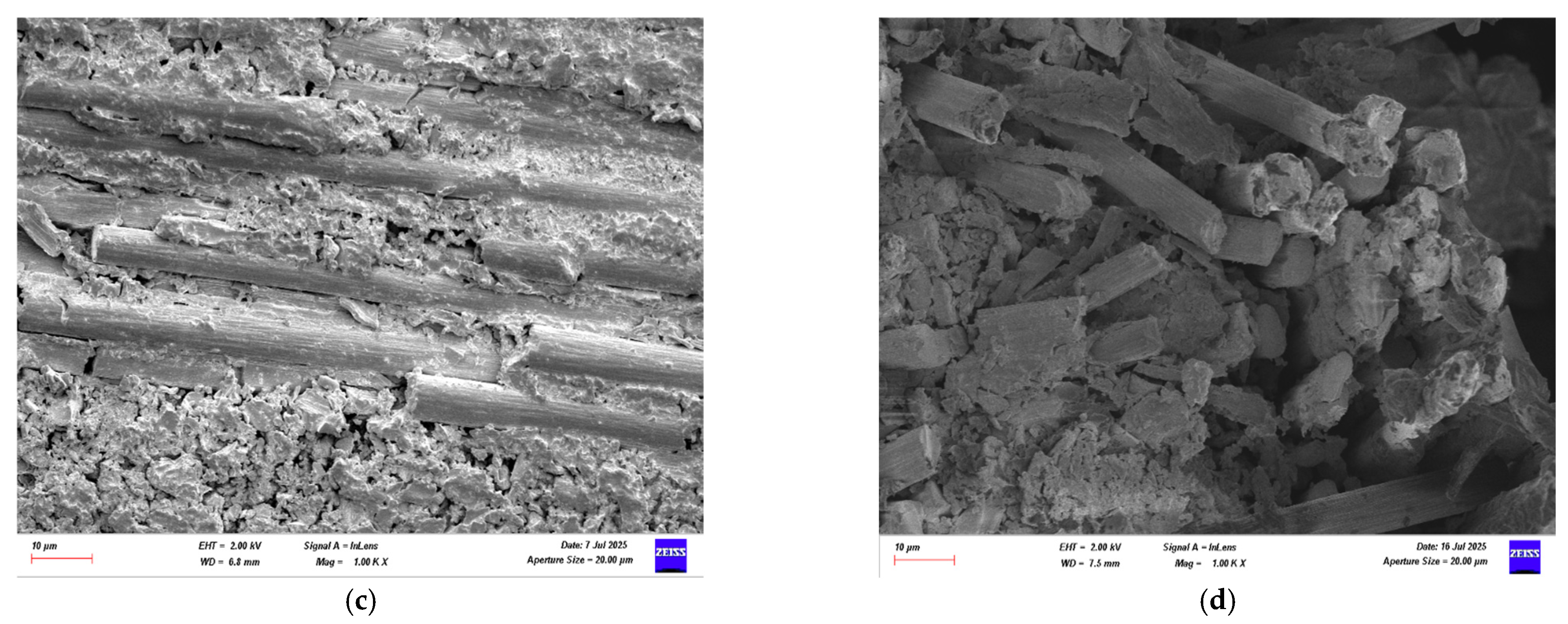 23]. The degradation of the fiber–matrix interface represents a critical damage mechanism that directly affects load transfer efficiency. Exposure to saltwater, UV radiation, and thermal cycling reduces interfacial strength and accelerates the formation of debonding [