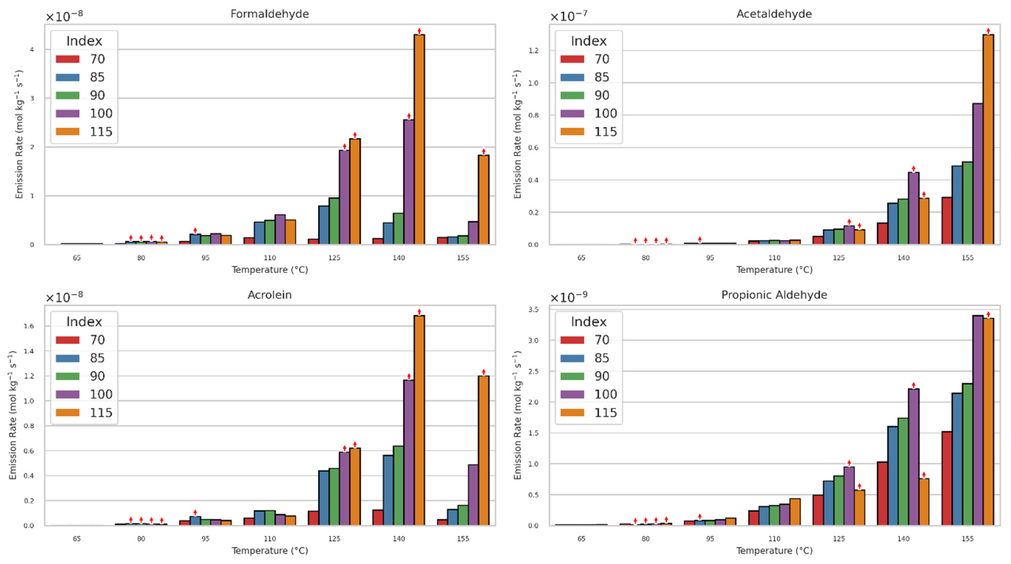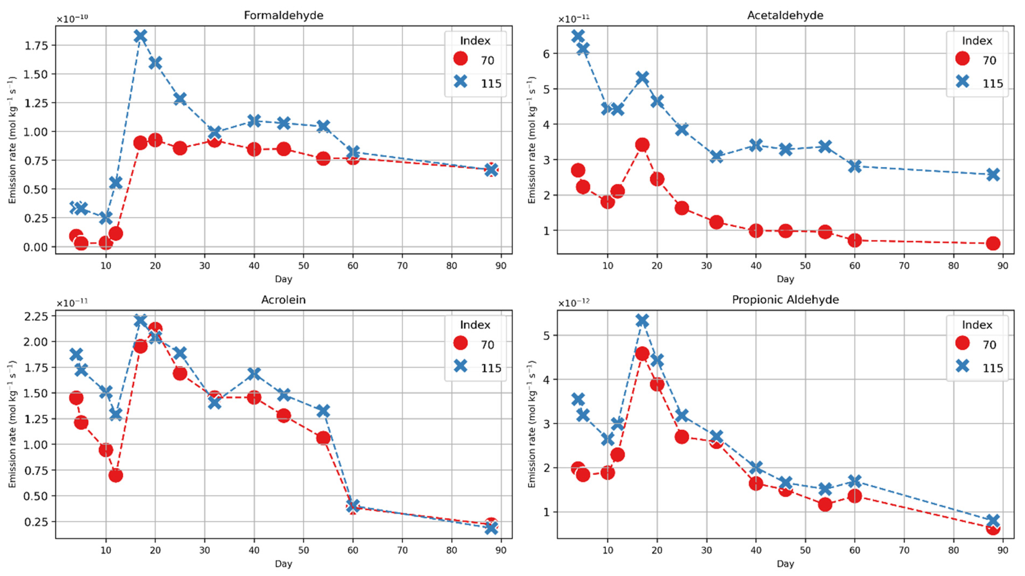 - All emissions peak after 17–20 days (induction time for hydroperoxide formation and depletion of residual phenolic antioxidant) and decline from there. The index dependence of formaldehyde emissions vanished after 30 days. Acetaldehyde emissions show index dependence over the full time of three months. Emissions of acrolein and propionic aldehyde do not show index dependence after the peak.