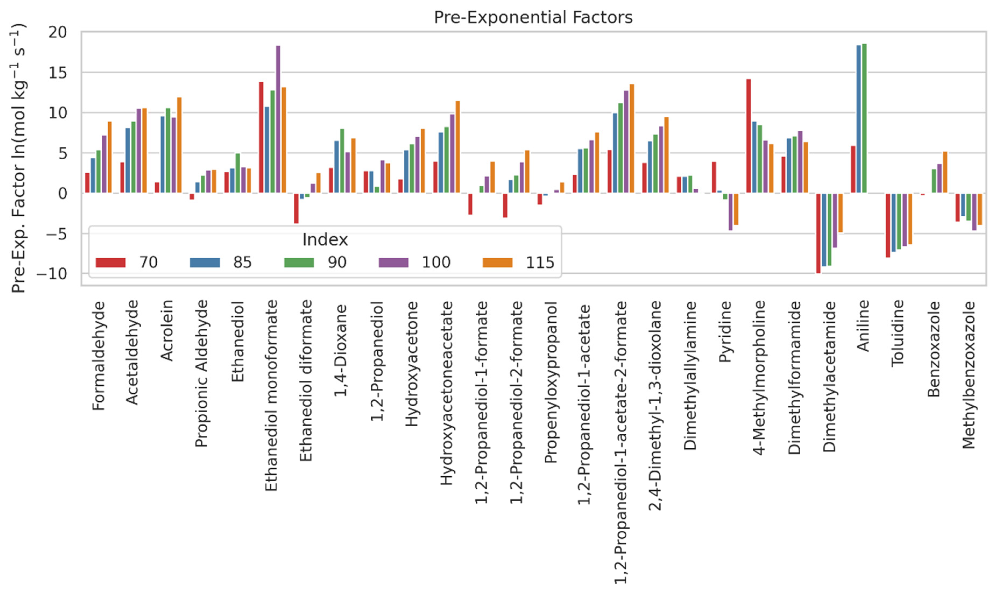| Analyte | Pre-Exponential Factor (ln (mol/(kg·s))) | |||||||