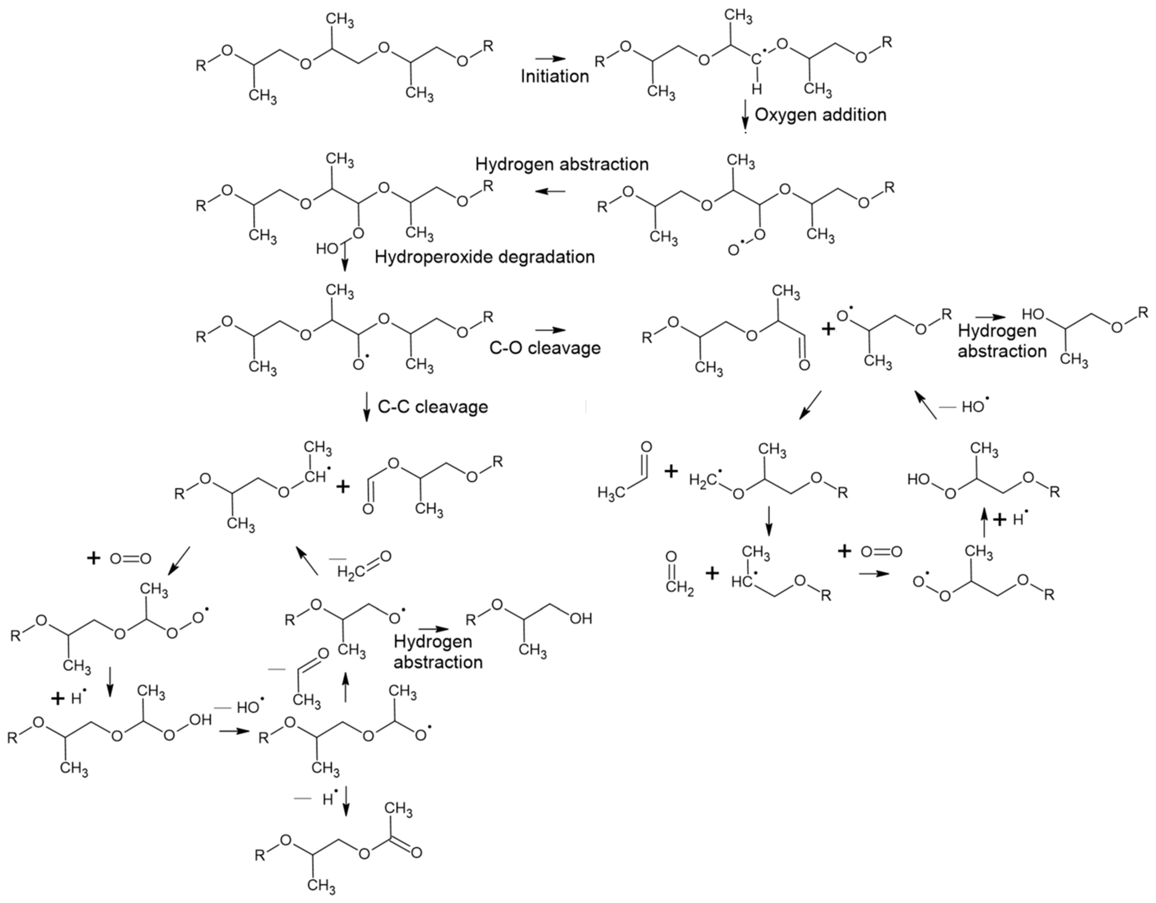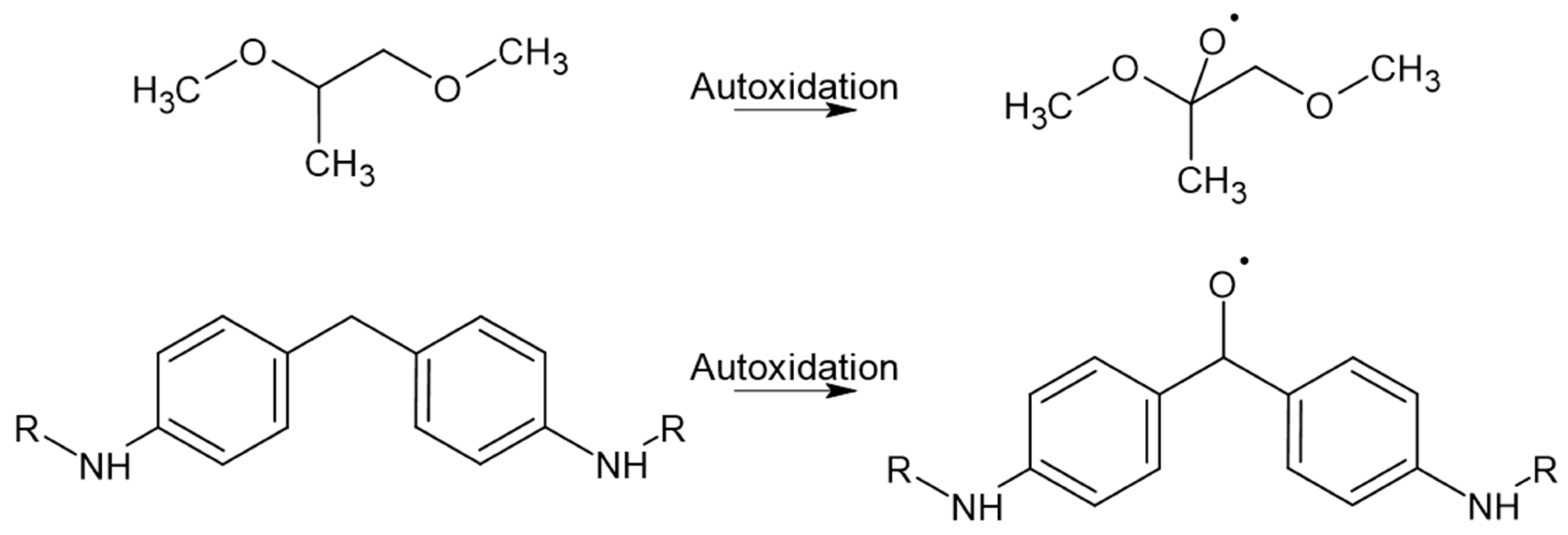 - Hähner, U.; Habicher, W.D.; Schwetlick, K. Studies on the thermooxidation of ethers and polyethers: Part I—The uninhibited thermooxidation of a polyether. Polym. Degrad. Stab. 1991, 34, 111–118. [Google Scholar] [CrossRef]