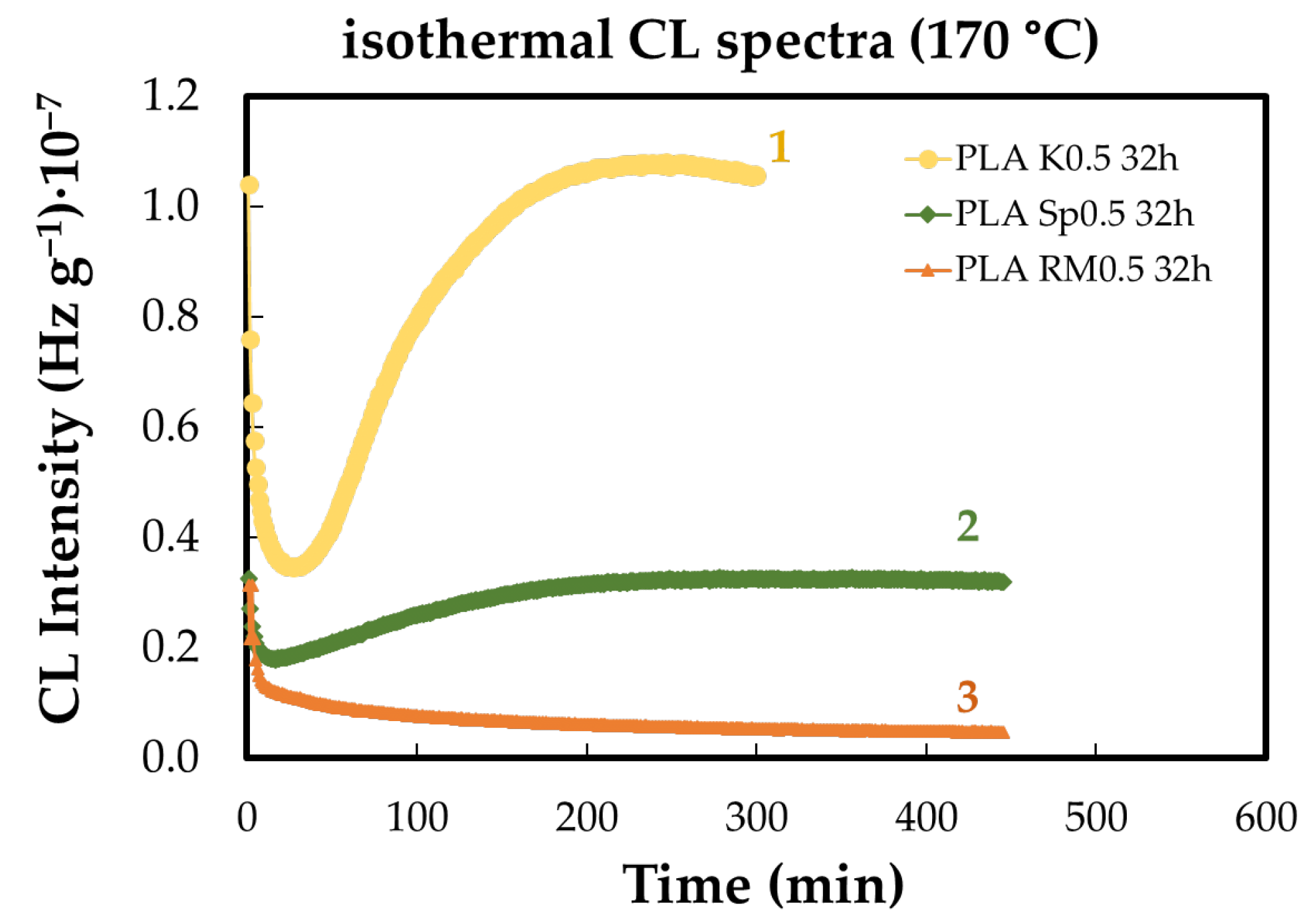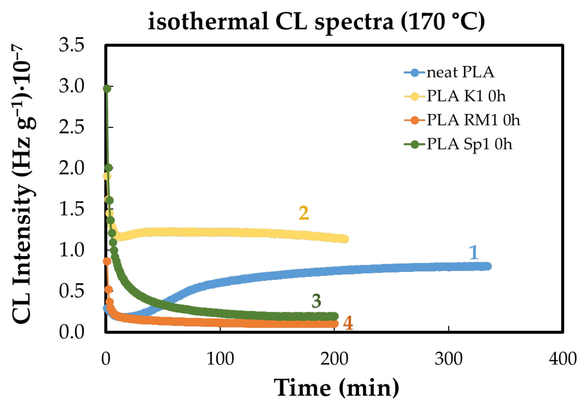- CL-derived oxidation induction times (OITs) reveal distinct stabilization efficiencies among the additives, with rosemary extract providing the longest OITs and kelp-based fillers the shortest, reflecting different abilities to delay oxidation onset.