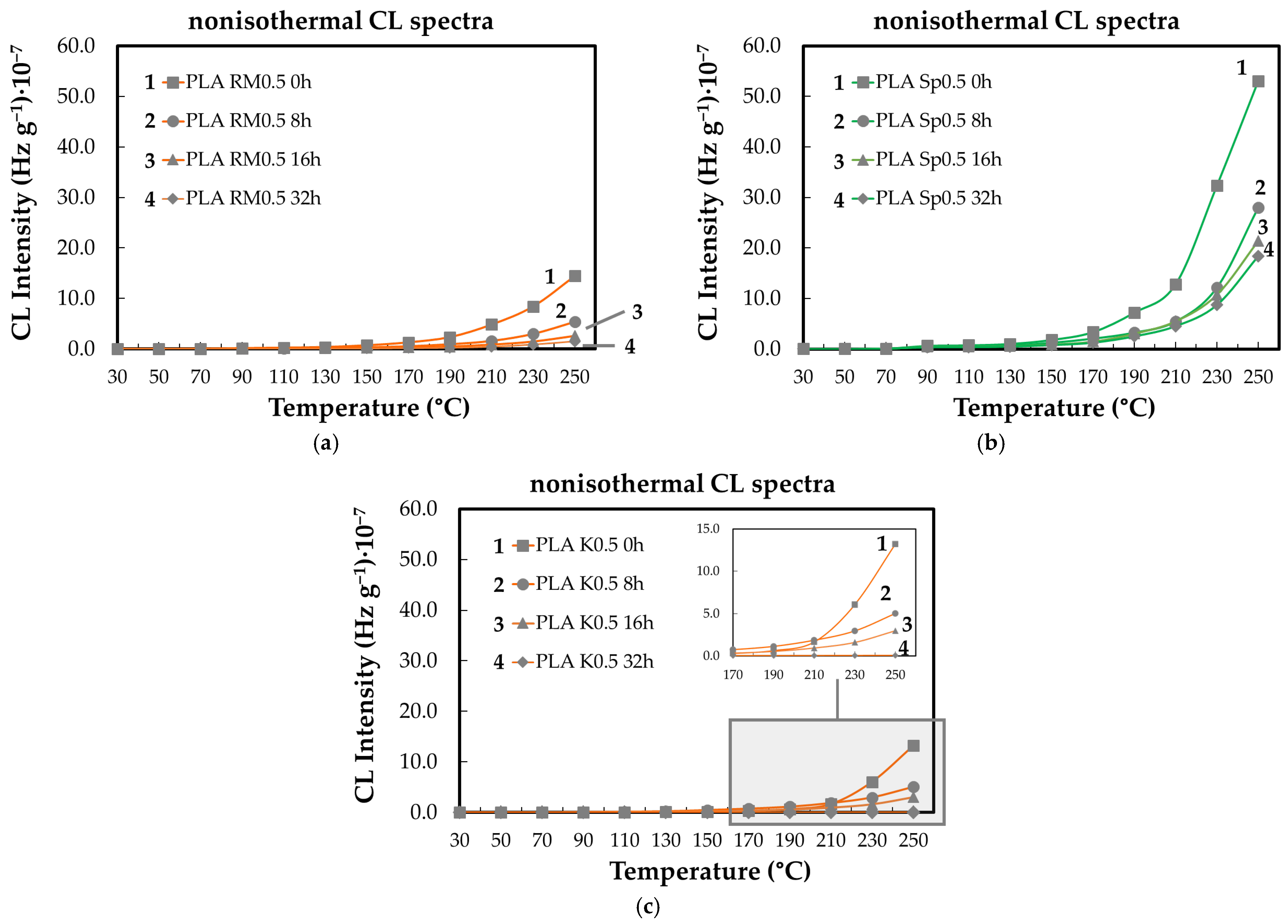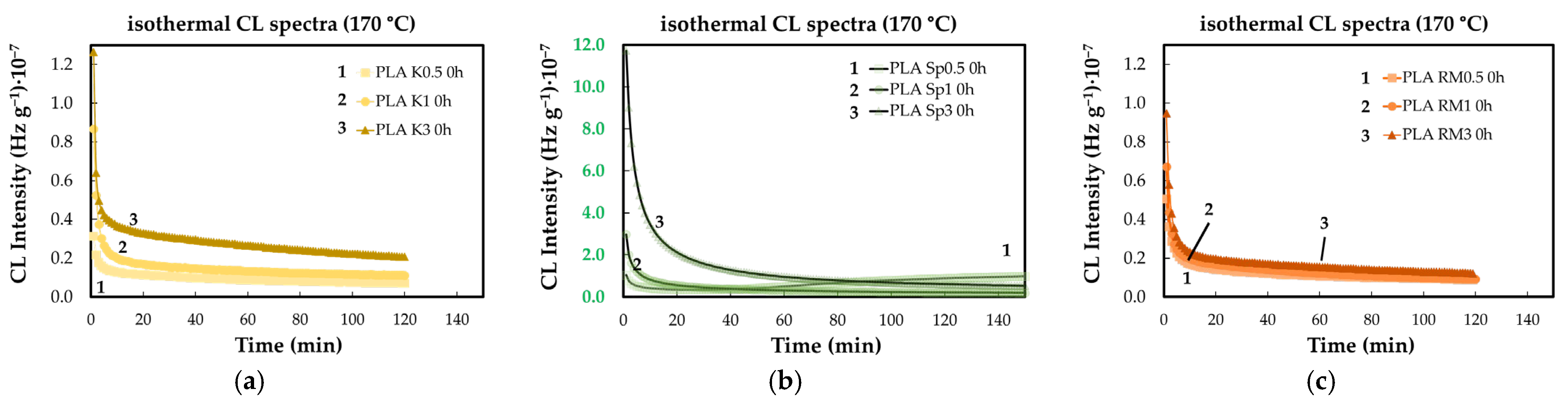 - Zaharescu, T.; Râpă, M.; Marinescu, V. Chemiluminescence kinetic analysis on the oxidative degradation of poly(lactic acid). J. Therm. Anal. Calorim. 2017, 128, 185–191. [Google Scholar] [CrossRef]