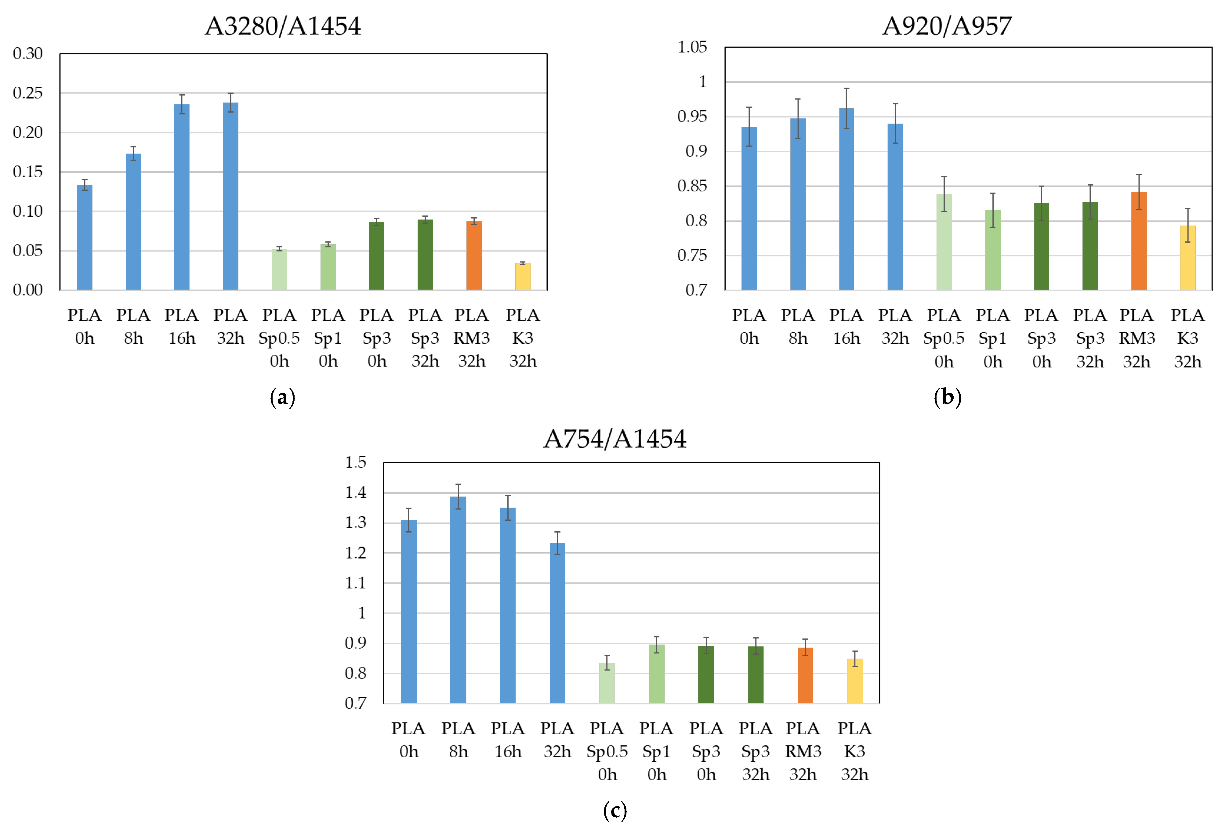 - These trends are consistent with DSC and FTIR results: rosemary extract increases Tg and limits hydroxyl-group formation, while biomass fillers mainly influence crystallization behavior and chain constraints through heterogeneous interfacial regions.