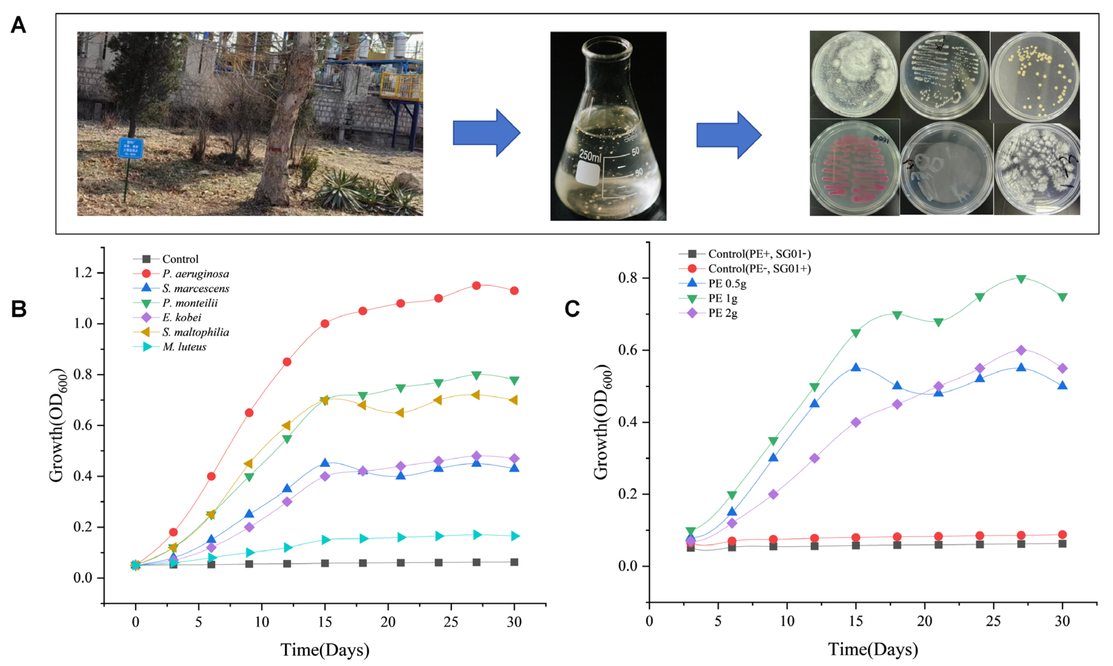Chicago/Turabian StyleDou, Xiaohan, Zhiqing Zhang, Fengyuan Zhang, Xi Yan, Yan Xie, Jingru Liu, and Shucai Zhang. 2026. "Pseudomonas aeruginosa SG01: A Novel Polyethylene-Degrading Bacterium in Petrochemical Wastewater" Polymers 18, no. 4: 519. https://doi.org/10.3390/polym18040519