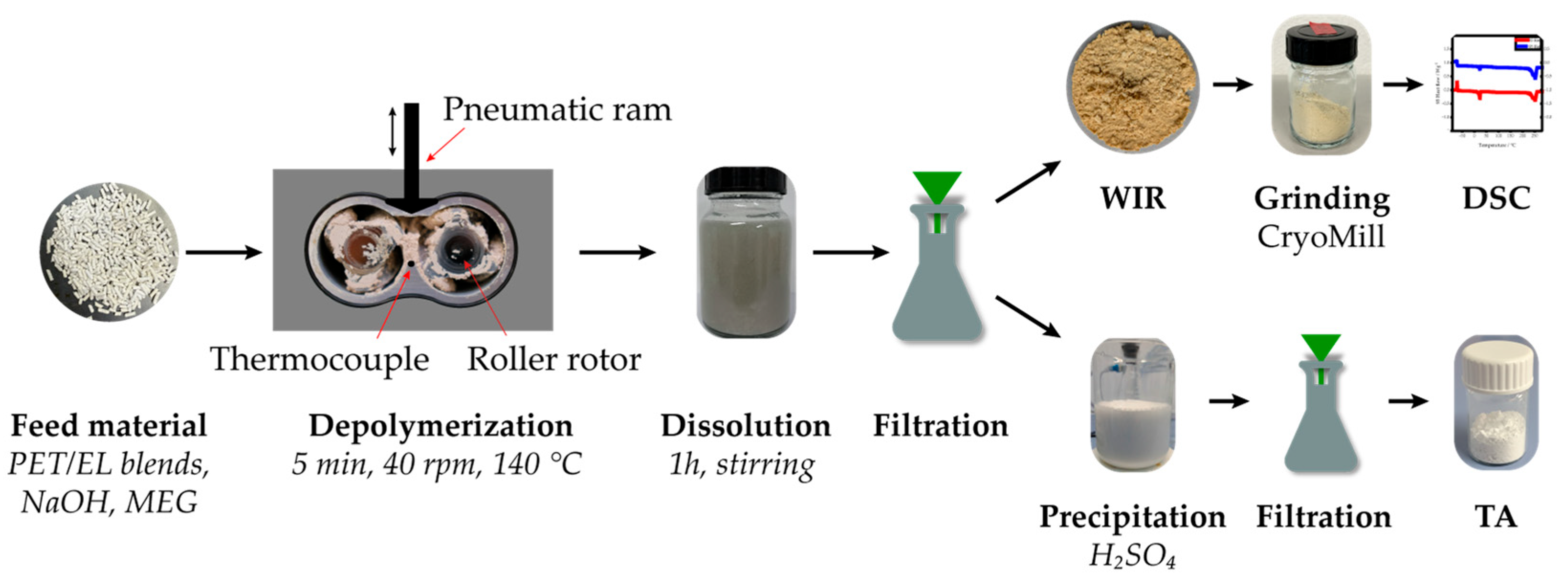 Depolymerization experiments were conducted in a laboratory kneader to investigate the behavior of elastane during alkaline PET depolymerization under quasi-solid-state conditions. The following sections describe the preparation of PET/EL materials, the depolymerization procedure, and the analytical methods applied to characterize both the recovered TA and the WIR. Emphasis was placed on reproducible reaction conditions and consistent analytical evaluation across materials of different compositions and bulk densities.