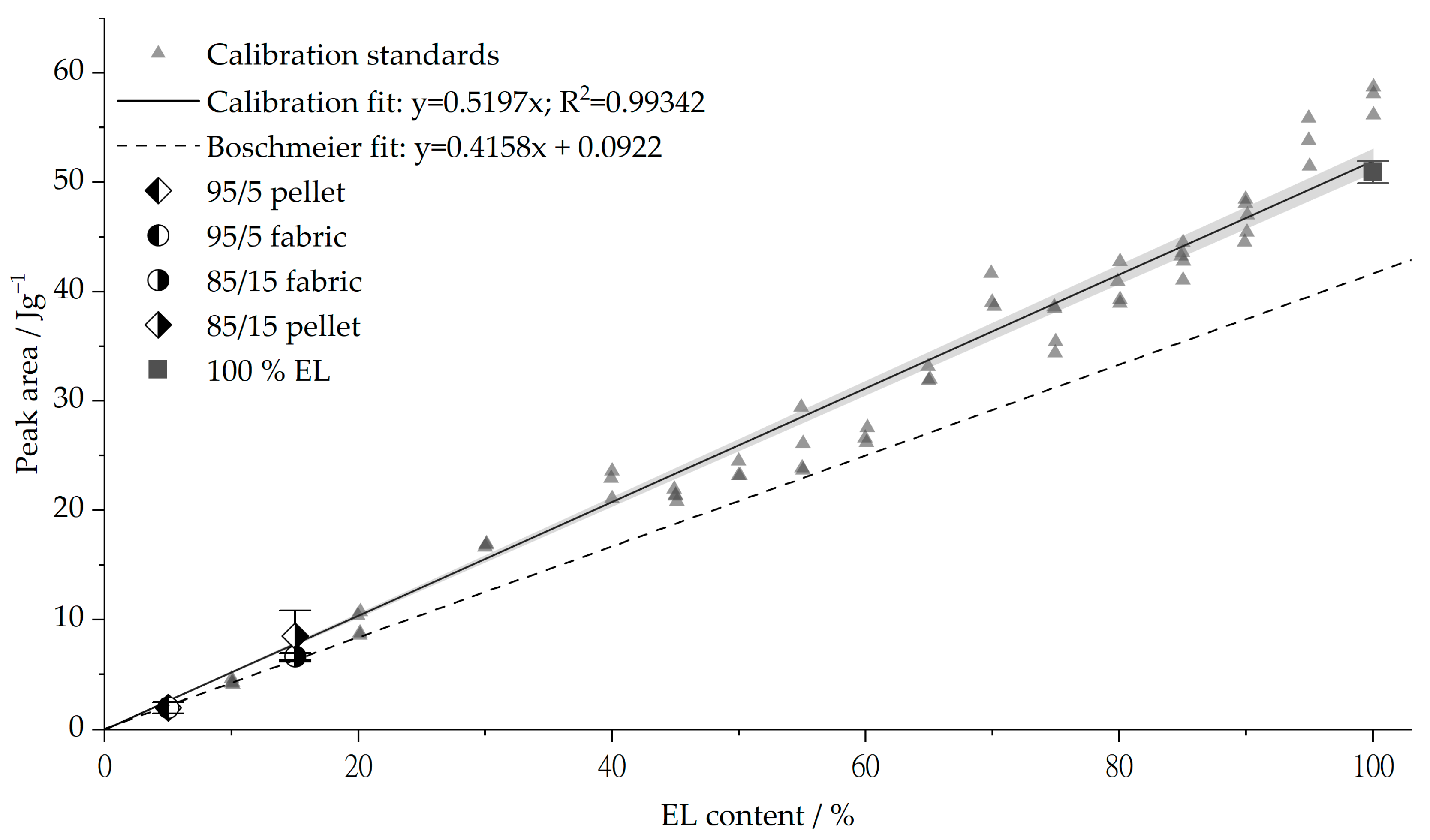 Figure 4 for comparison. Both materials follow the general trend of the calibration curve, and the 100 wt% EL sample lies within the calibration range. The measured peak areas for pelletized and non-pelletized fabrics are close, with a slight tendency toward higher peak areas for the pelletized samples. This small deviation may reflect residual thermal effects introduced during pelletizing or minor differences in sample packing, but it does not alter the overall linear relationship. Both types of materials were analyzed without prior cryogenic grinding; therefore, effects associated with cryogenic treatment are limited to the calibration standards.
