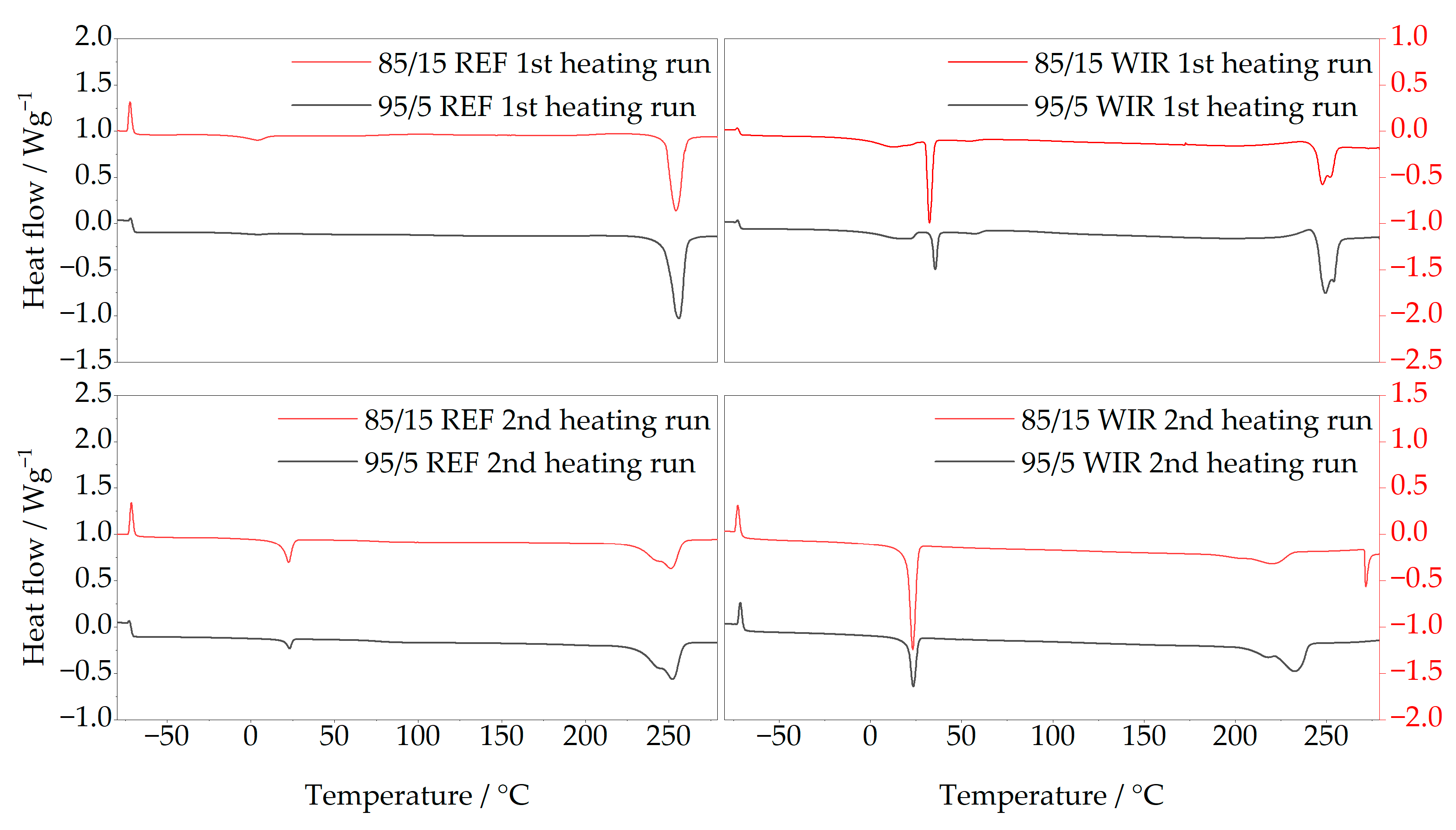 Figure 5 shows representative thermograms of the PET/EL reference materials before alkaline treatment (left column) and the corresponding WIR samples after depolymerization (right column). The upper row displays the first heating runs from −80 °C to 280 °C, and the lower row the second heating run. In each plot, the upper trace corresponds to the 85/15 material and the lower trace to the 95/5 material.