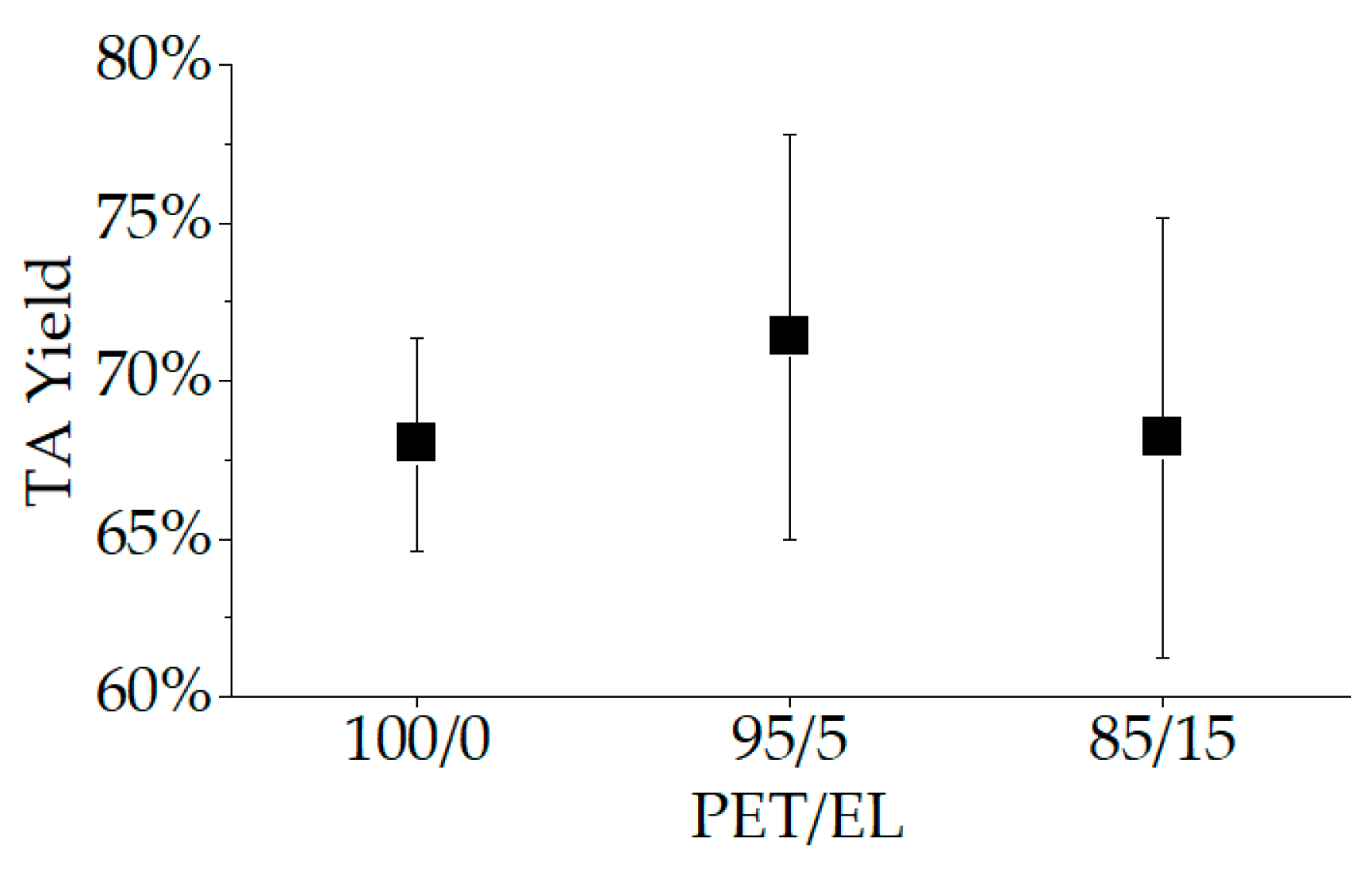 The gravimetrically determined TA yields were 68% ± 3.4% for pure PET (100/0), 71% ± 6.4% for 95/5, and 68% ± 7.0% for 85/15 (