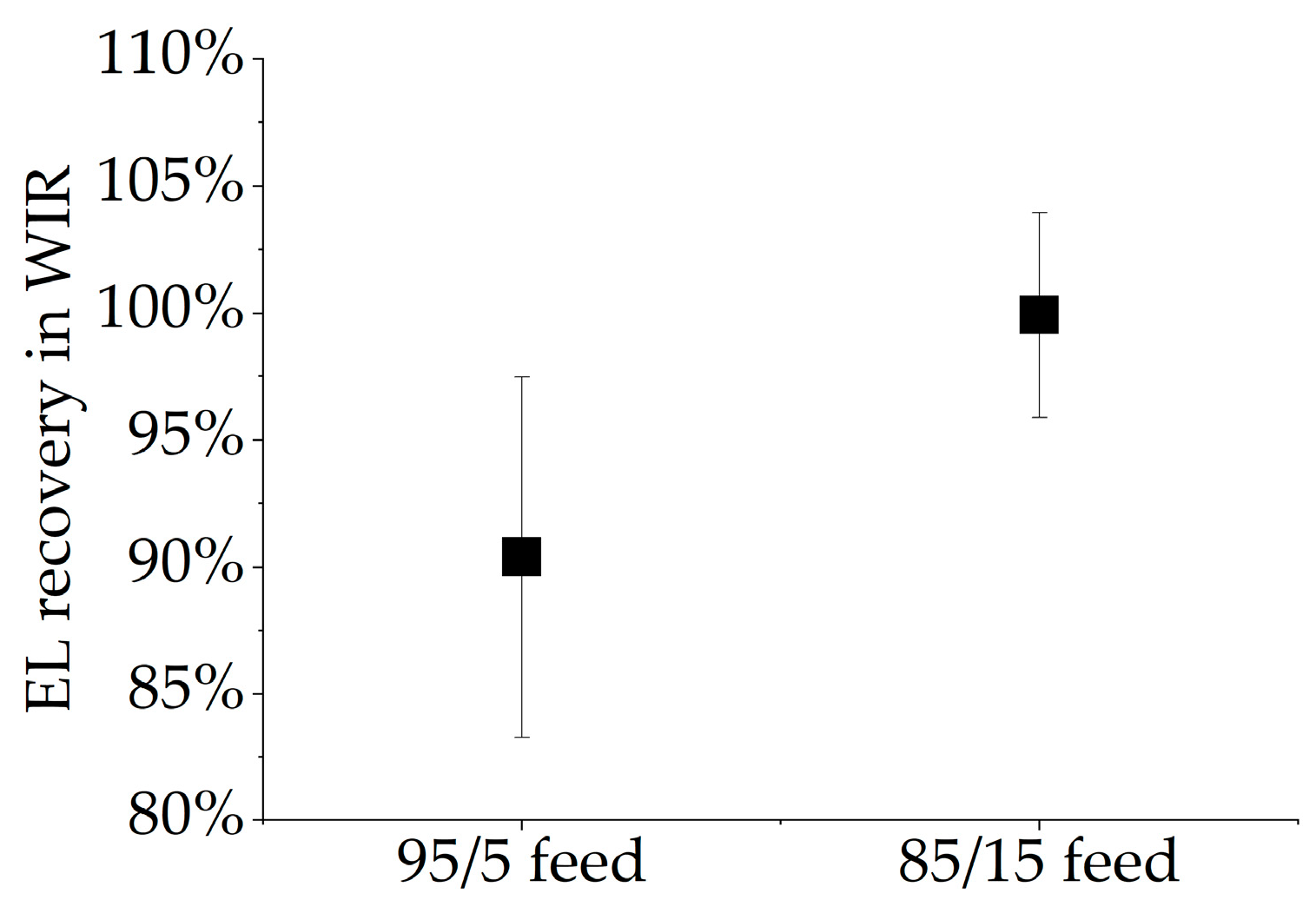 Mean apparent EL recoveries were about 90% for 95/5 and close to 100% for 85/15, with individual measurements exceeding 100% (
